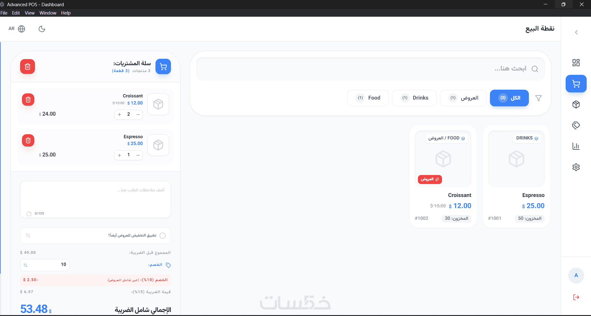 إدارة المبيعات: معالجة العمليات، حساب الضرائب والخصومات، وإضافة ملاحظات الطلبات.