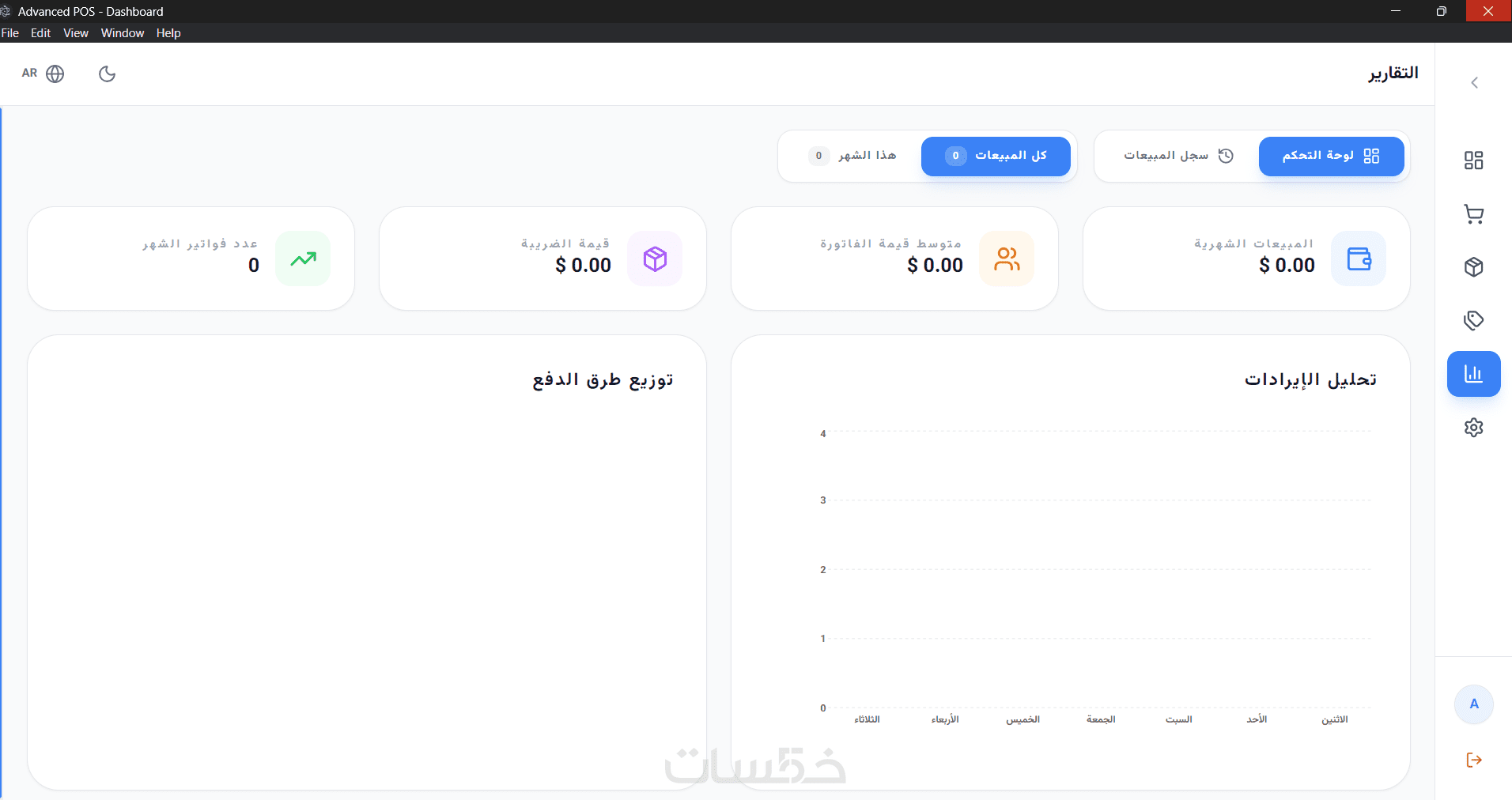 التقارير: لوحة تحكم تفاعلية مع رسوم بيانية لتحليل الإيرادات وطرق الدفع.