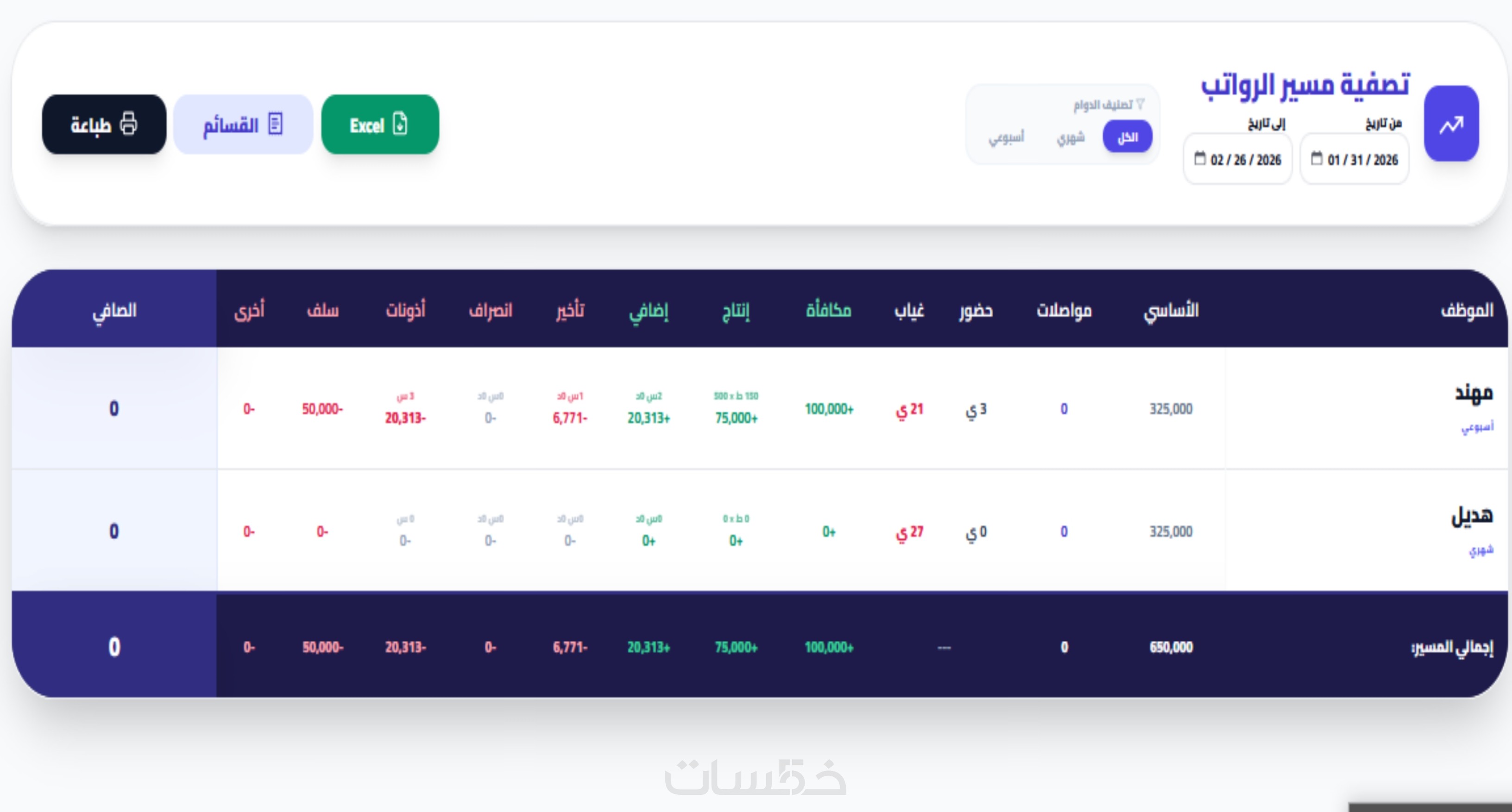 برنامج SAM HR PRO صممته لك بدقة متناهية هو نظام متكامل لإدارة شؤون الموظفين داخل الشركات والمنشآت. يتيح تسجيل جميع بيانات الموظفين الأساسية وإنشاء هيكل إداري كامل للأقسام والوظائف. يدعم البرنامج إدارة الحضور والانصراف يدويًا مع عرض التأخيرات والغياب. كما يوفر نظامًا شاملاً للأذونات والإجازات، ومتابعة السندات المالية مثل الخصومات والمكافآت والحوافز. يشمل أيضًا إدارة السُلف وخطط السداد، وتتبع إنتاج الموظفين وحساب الأداء. يقوم النظام بحساب الرواتب تلقائيًا وفق السياسات المعتمدة مع إمكانية استخراج مسيّر الرواتب. يحتوي على قسم وثائق متكامل لتنظيم المستندات والتنبيه قبل انتهاء صلاحيتها، إضافة لتقارير احترافية قابلة للتخصيص. يدعم تخصيص كامل لإعدادات الشركة وصلاحيات المستخدمين وخيارات استيراد وتصدير البيانات، مما يجعله الحل المثالي لإدارة الموارد البشرية بكفاءة