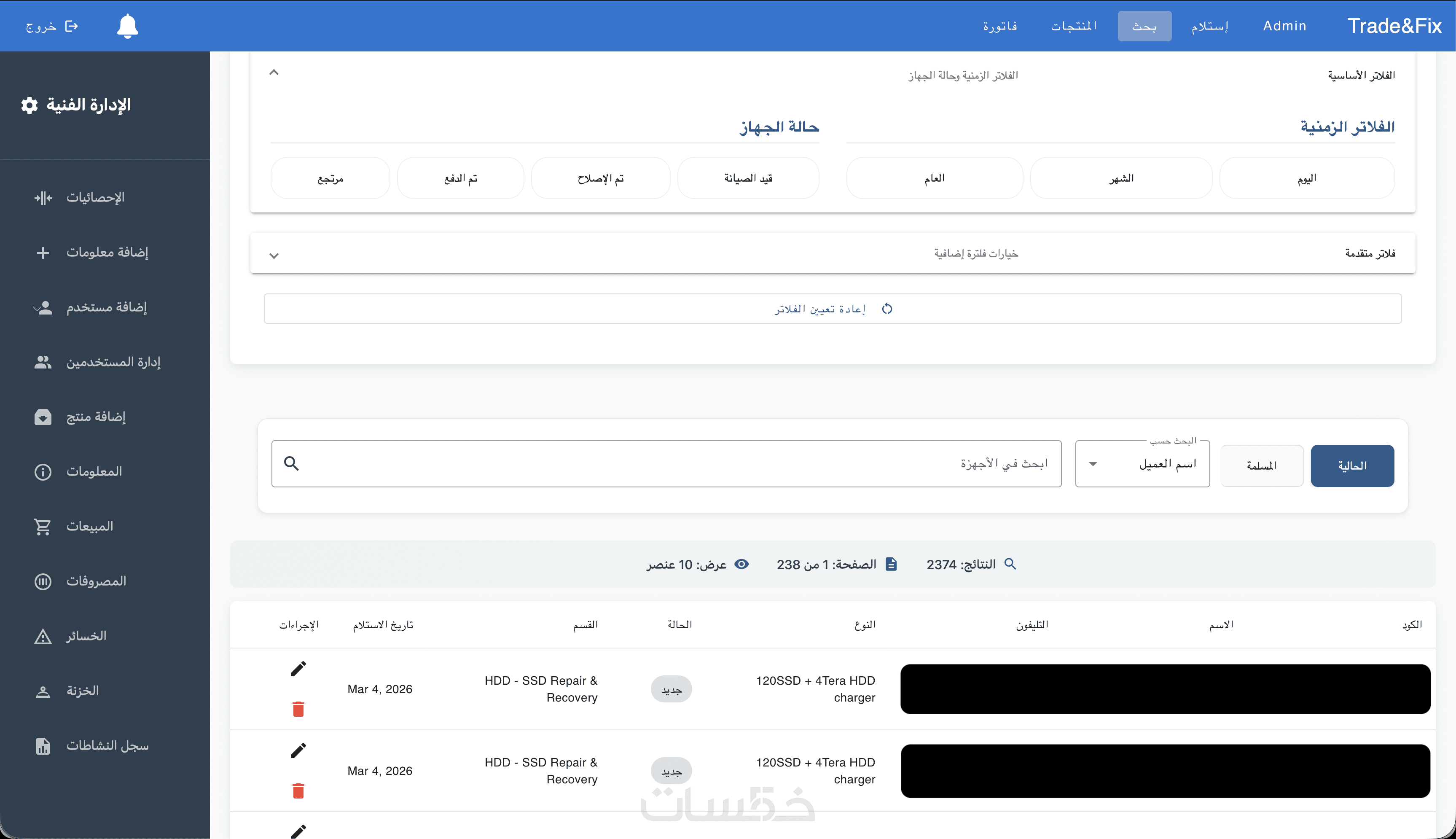 تتبع كامل من الاستلام حتى التسليم مع أرشفة سجل الإصلاحات وتتبع حركة الأجهزة بين الفنيين عبر سجل تدقيق شفاف.