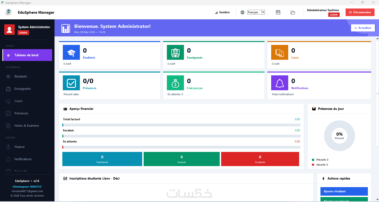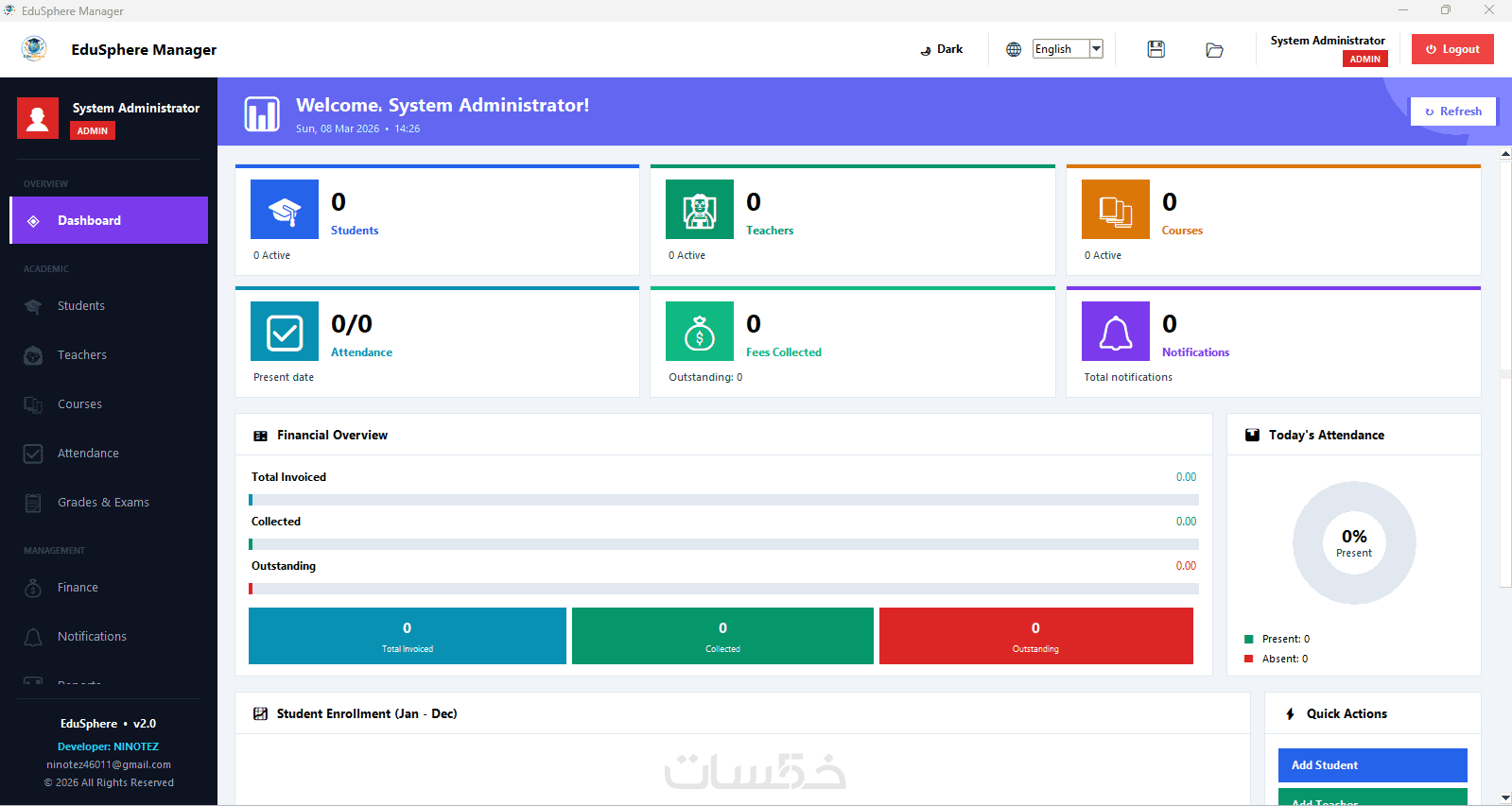البرنامج يساعدك على إدارة جميع عمليات مؤسستك من مكان واحد، بدءًا من إدارة الطلاب والمعلمين، مرورًا بالحضور والغياب، وصولاً إلى الفواتير والتقارير المالية.