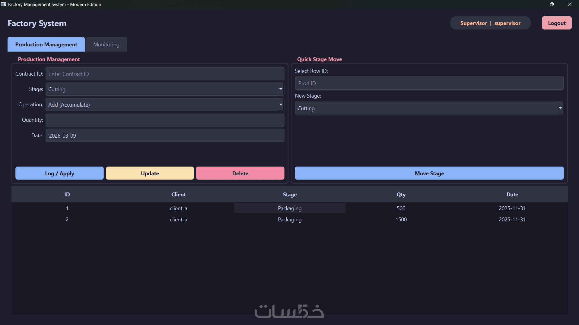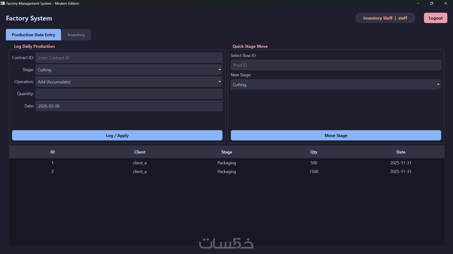 تسجيل مراحل التصنيع (قص، خياطة، تشطيب، تغليف) مع إمكانية التعديل أو التصحيح.
