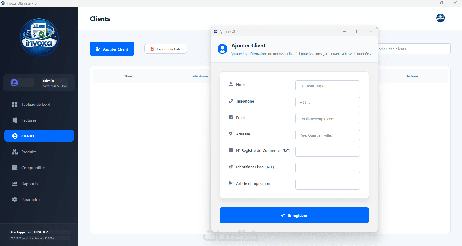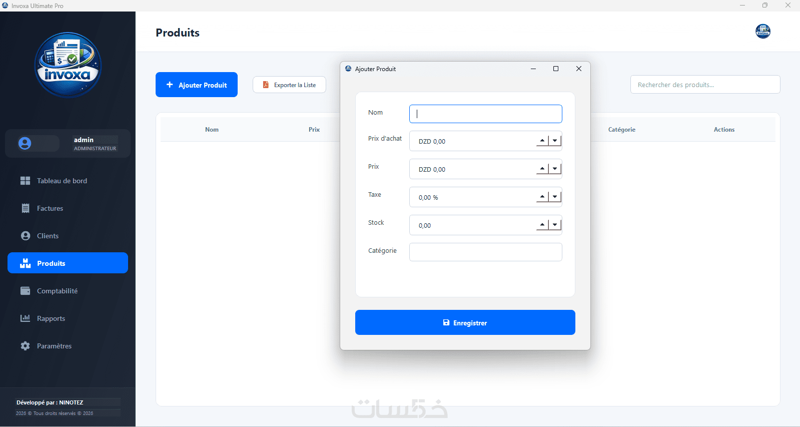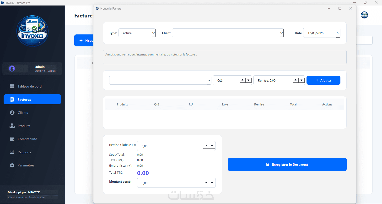 دعم تلقائي لحساب ضريبة القيمة المضافة (TVA) والطابع المالي (Timbre Fiscal) حسب المعايير المعمول بها.