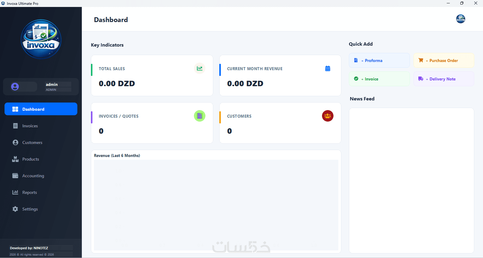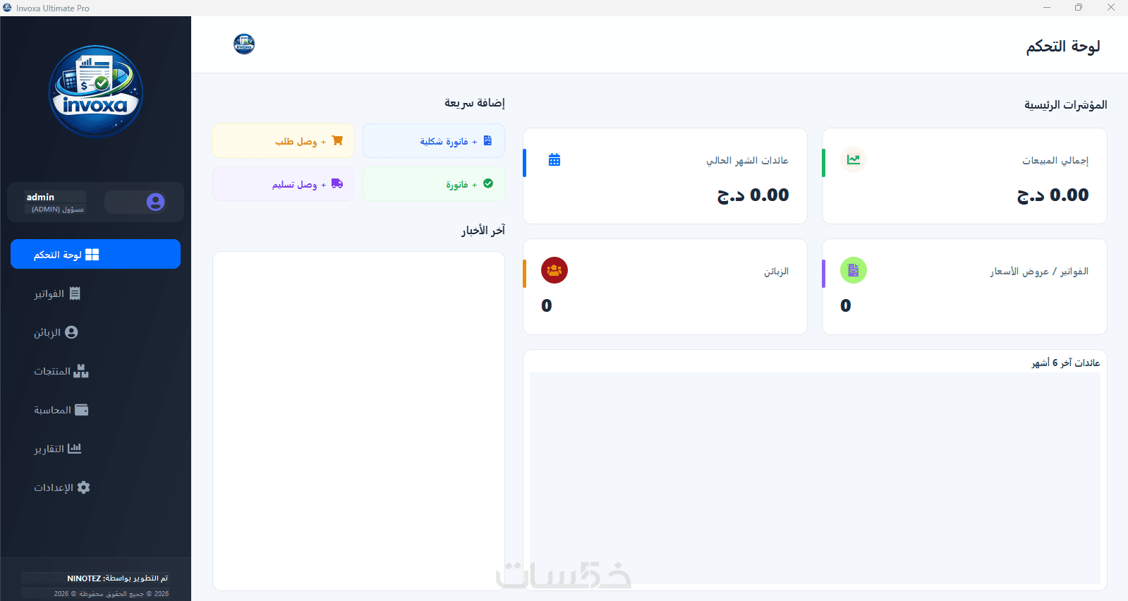 لوحة تحكم (Dashboard) تعرض لك أداءك التجاري عبر رسوم بيانية تفاعلية (أرباحك، نفقاتك، وأفضل زبائنك).