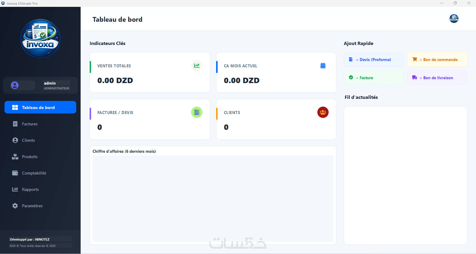 أضف شعار شركتك، الختم الرقمي الخاص بك، ومعلوماتك الضريبية (NIF, NIS, RC, ART) لتظهر في مطبوعاتك الاحترافية.