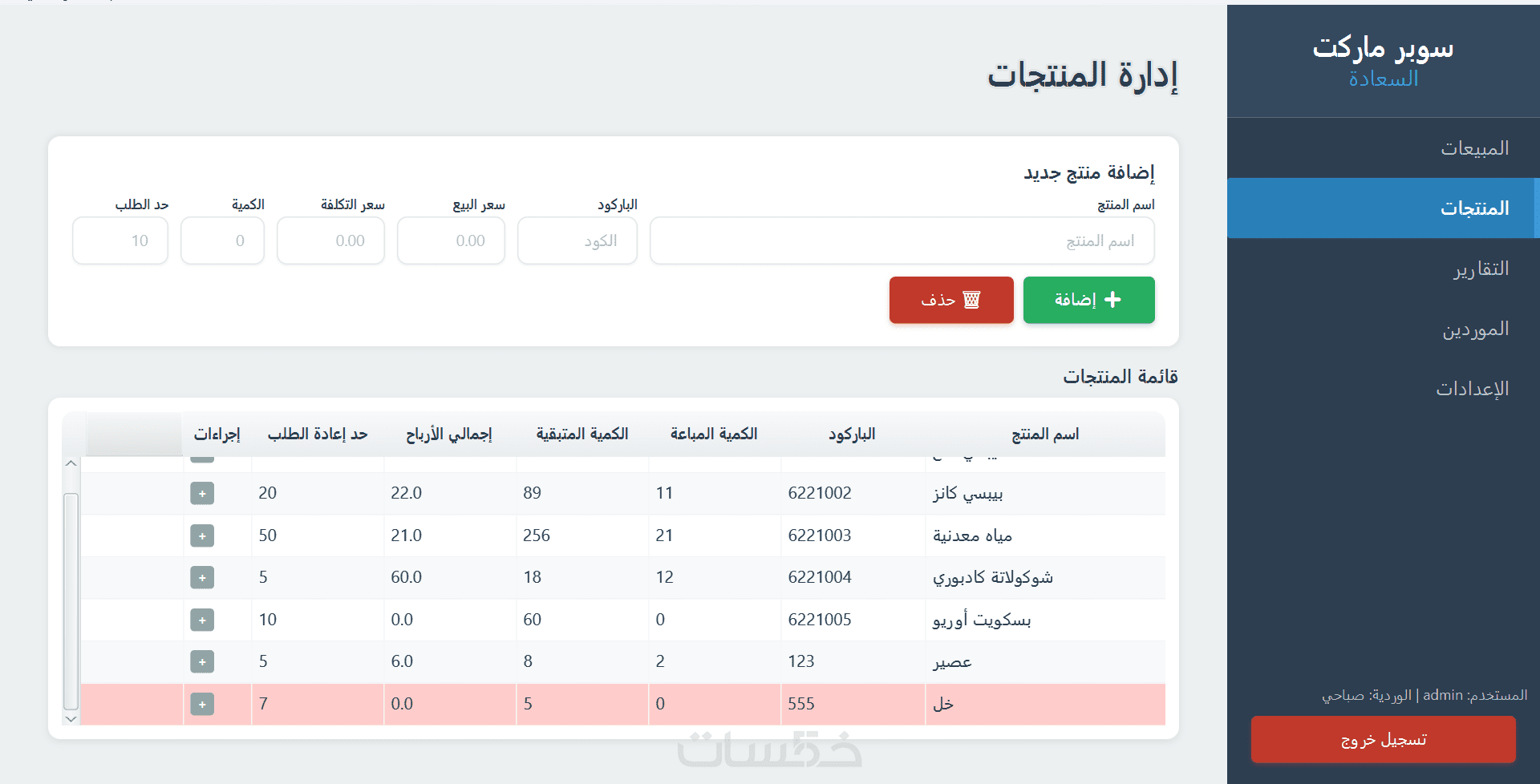 إدارة المخازن: إضافة وتعديل وحذف المنتجات (حتى 500 صنف).