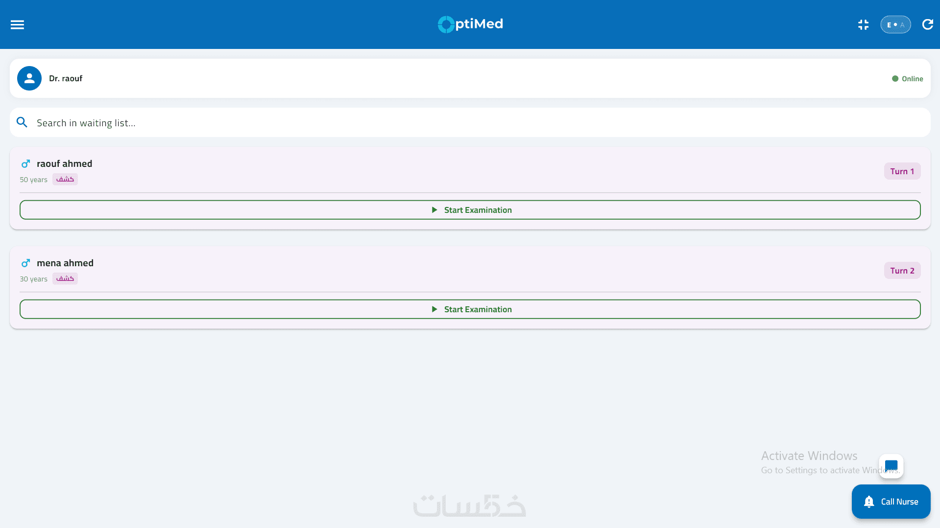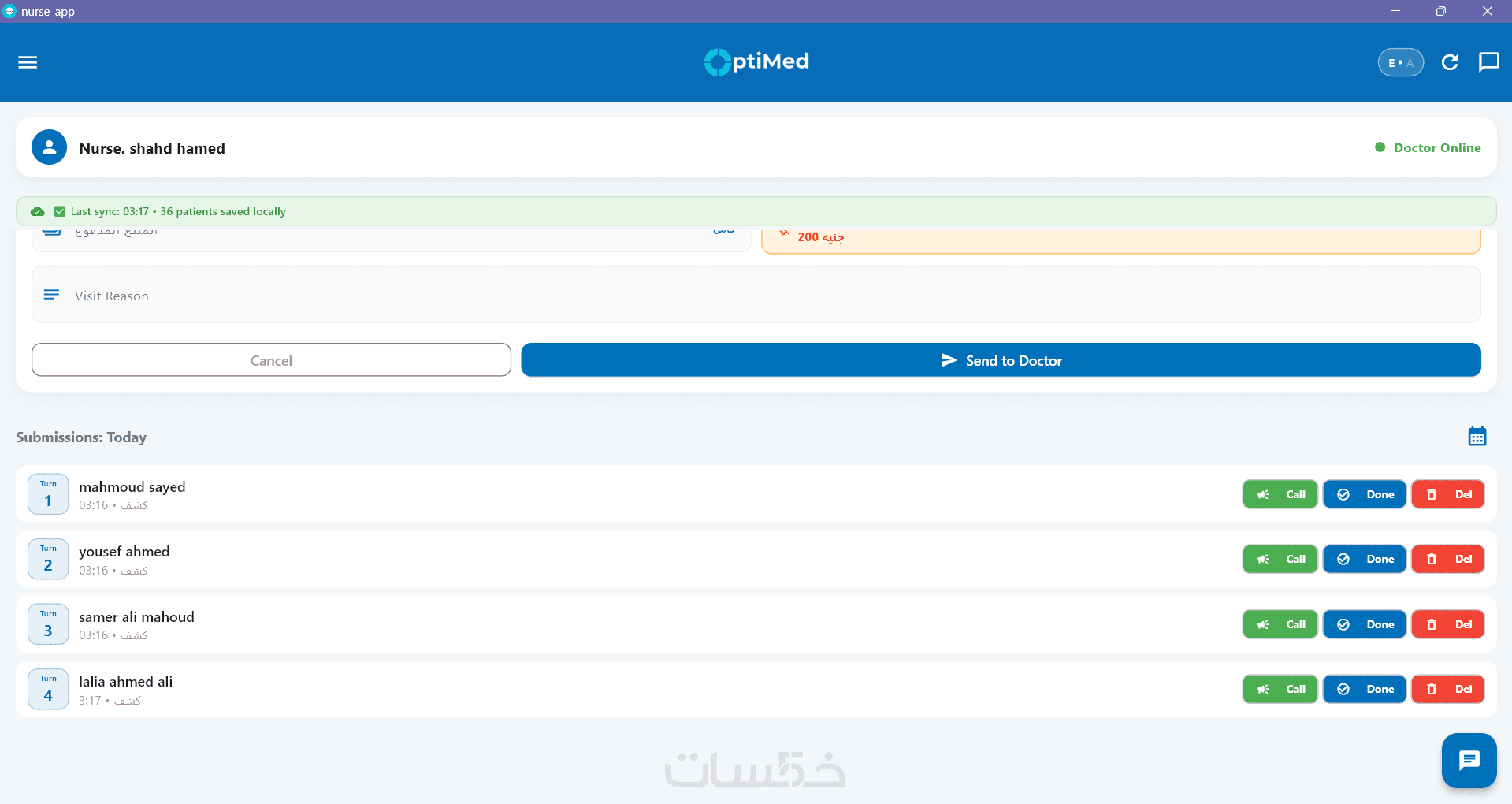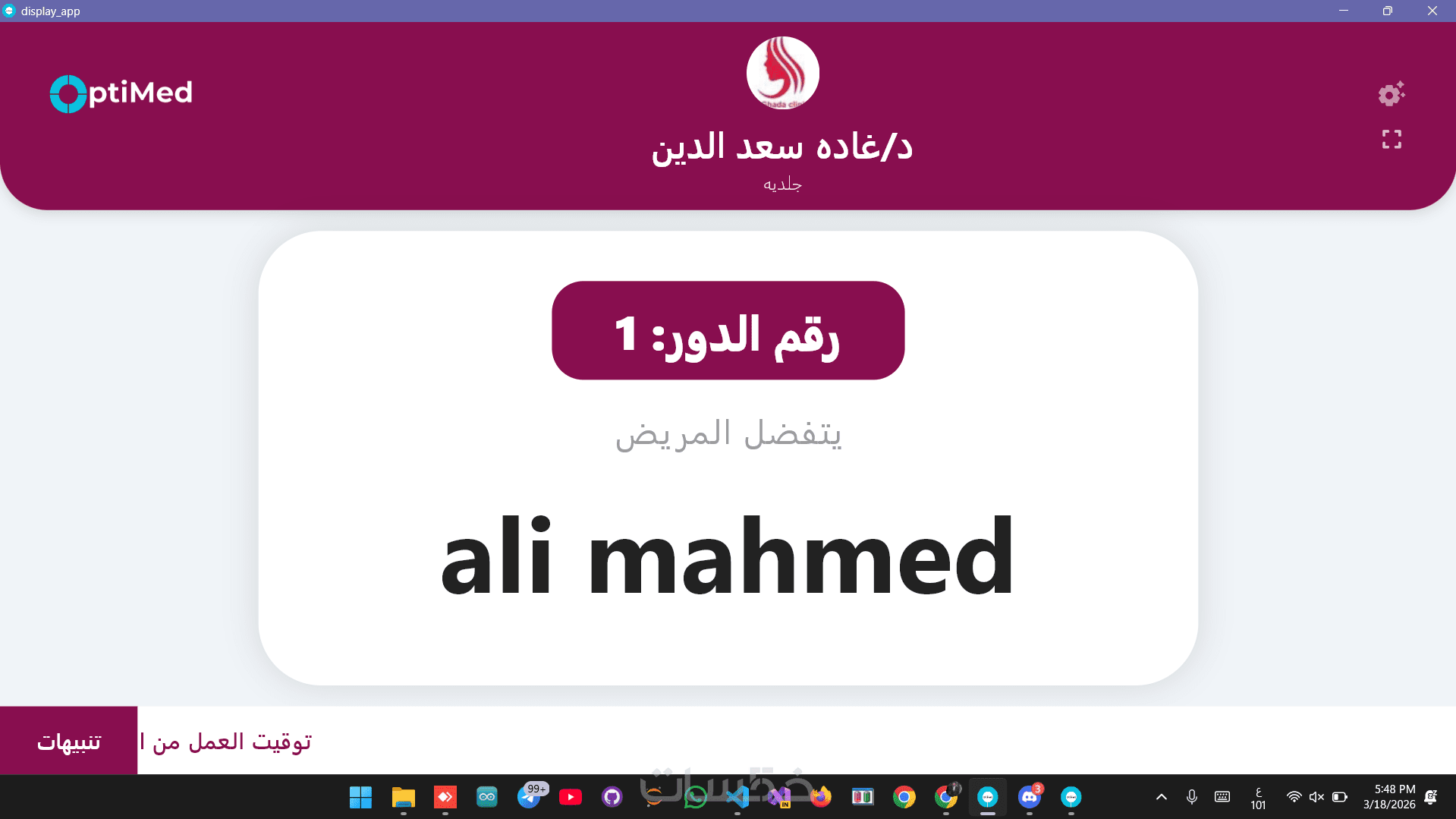 نسخة كاملة من نظام أوبتي ميد لإدارة العيادة تشمل الطبيب والممرضة وشاشة عرض المرضى