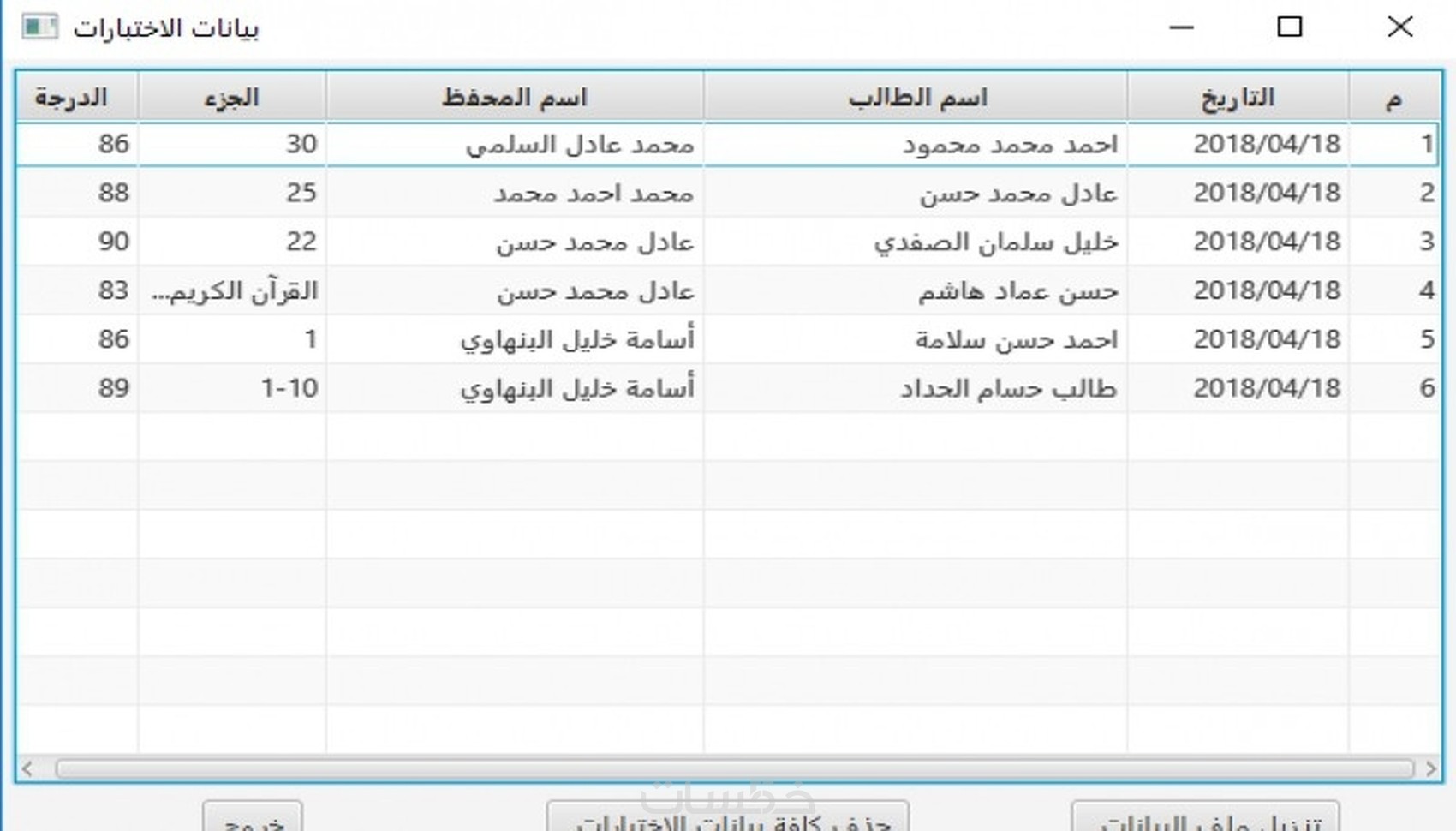 - عند نجاح الطالب في الإختبار فإن البرنامج يخزن بيانات الطالب والاختبار داخل ملف ويمكنك عرض هذه البيانات داخل البرنامج واستخراجها الى ملف اكسل أو حذفها