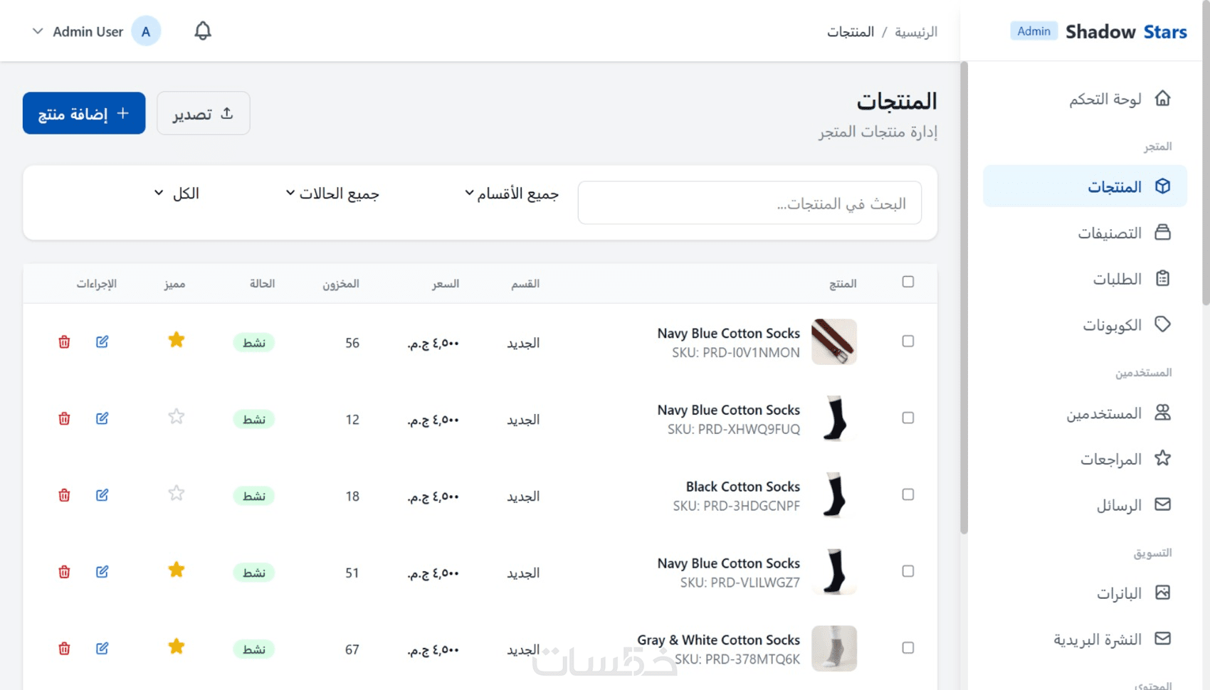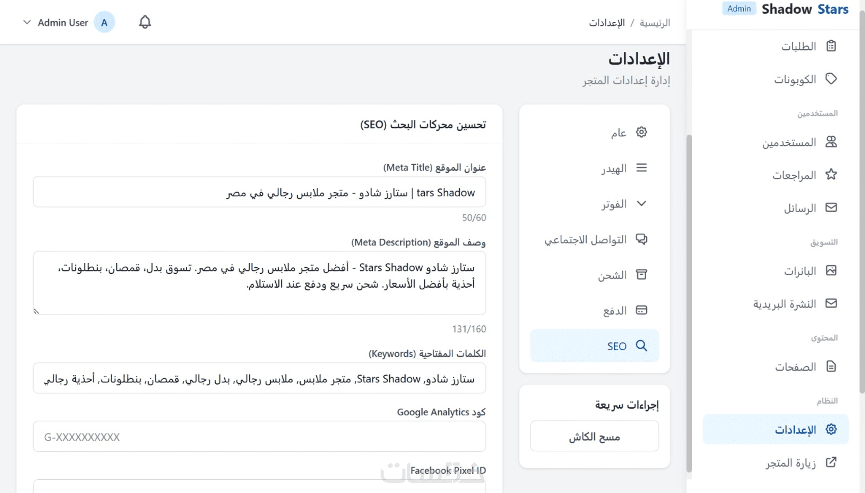 متجر الكتروني ديناميكي بشكل كامل لتحكم في كل شي من اول اضافه المنتجات والتصنيفات و الطبات والكوبونات والمتسخدمين والعملاء والمرجعات والرسائل والبنارات والنشره البريديه والصفحات وال SEO و الاعدادات و الهيدر والفوتر وااعلانات والشحن و التواصل الاجتماعي و الدفع