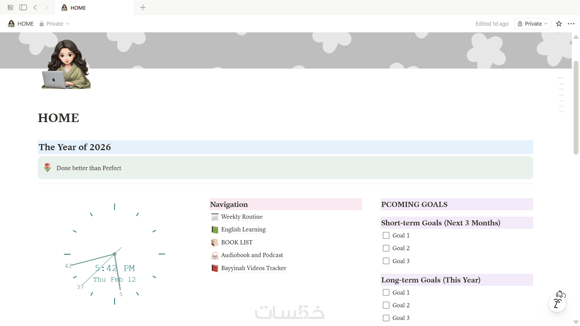 قالب Notion جاهز وسهل الاستخدام، قابل للتعديل بالكامل، يعمل على الموبايل والكمبيوتر مع تنظيم واضح للمهام والأهداف