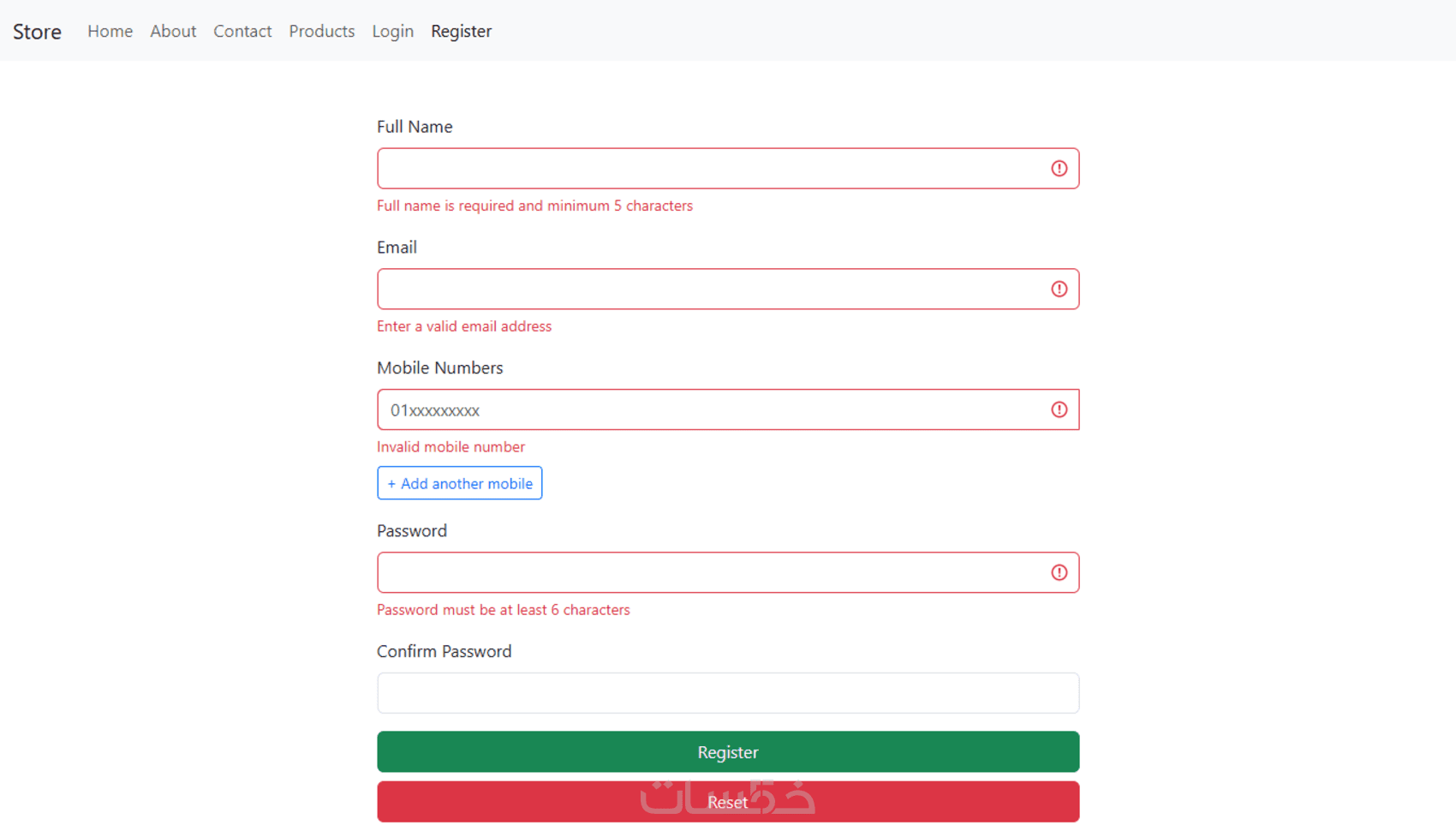 نموذج تسجيل المستخدمين (Register): باستخدام Reactive Forms مع نظام تحقق من صحة البيانات مثل البريد الإلكتروني وكلمة المرور ورقم الهاتف.