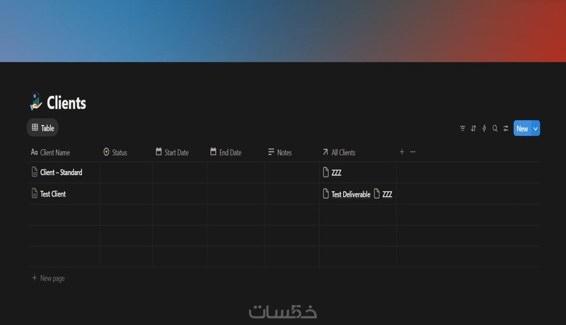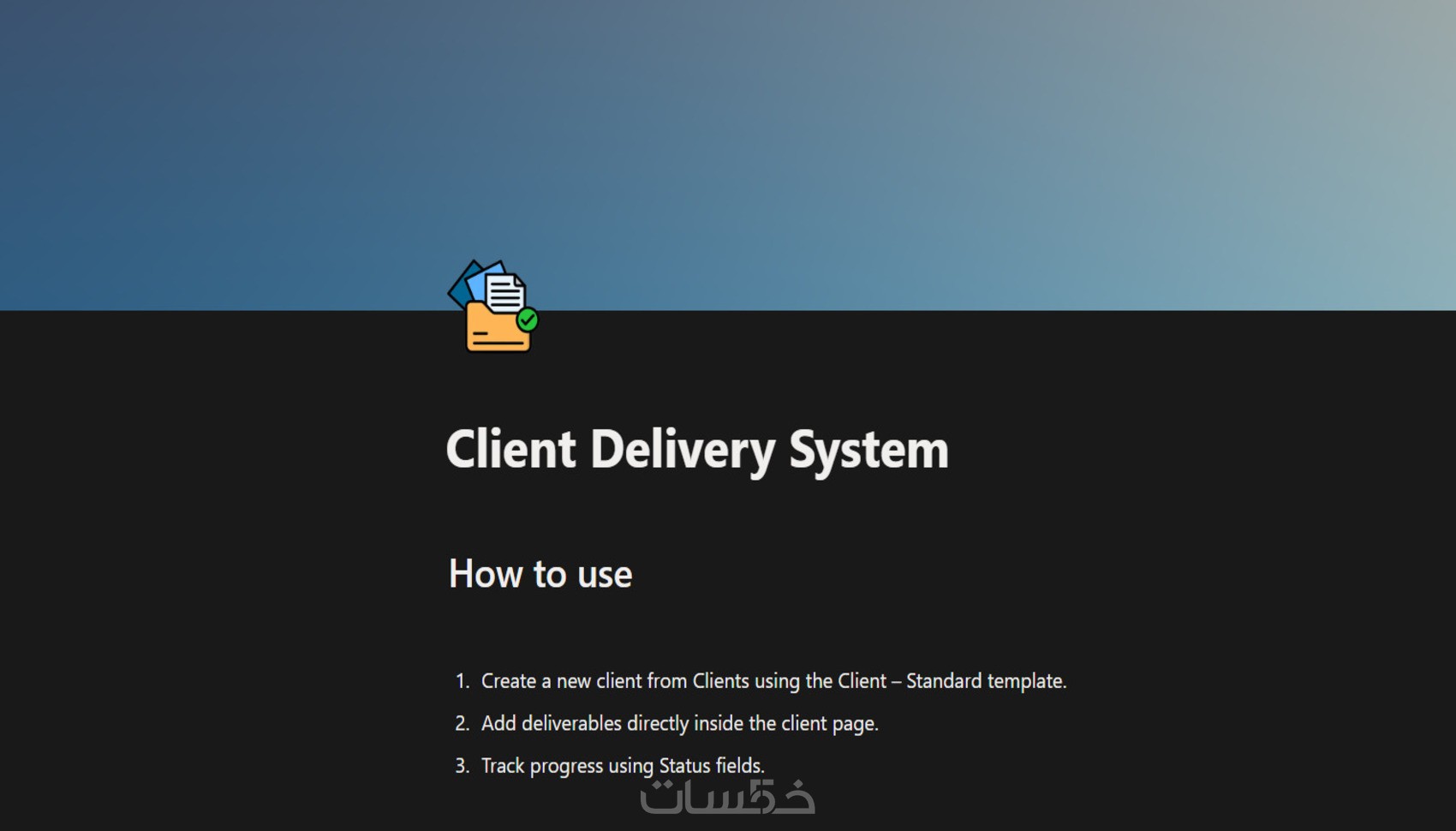 نظام تشغيل بسيط لإدارة تسليم الخدمات، يجمع كل بيانات وملفات ومهام كل عميل في صفحة واحدة، مع Dashboard توضح العملاء النشطين والتسليمات القادمة، وتتبع واضح لكل مشروع من الطلب وحتى التسليم. يناسب المستقلين والشركات الخدمية الصغيرة ومقدمي خدمات B2B الذين يعانون من ضياع التفاصيل وغياب رؤية واضحة لحالة المشاريع