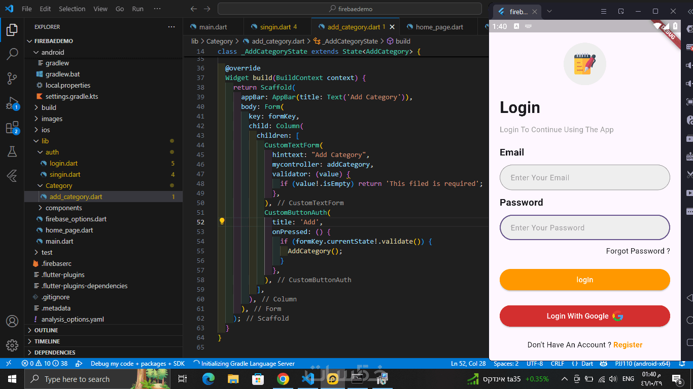 دمج Firebase للتسجيل والمصادقة وقواعد البيانات