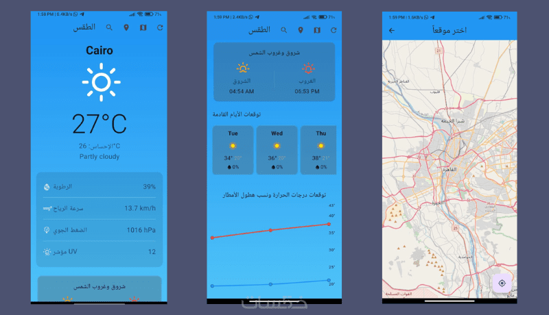 شاشتين أساسيتين (مثال: شاشة رئيسية + صفحة تفاصيل أو تسجيل دخول + حساب المستخدم)