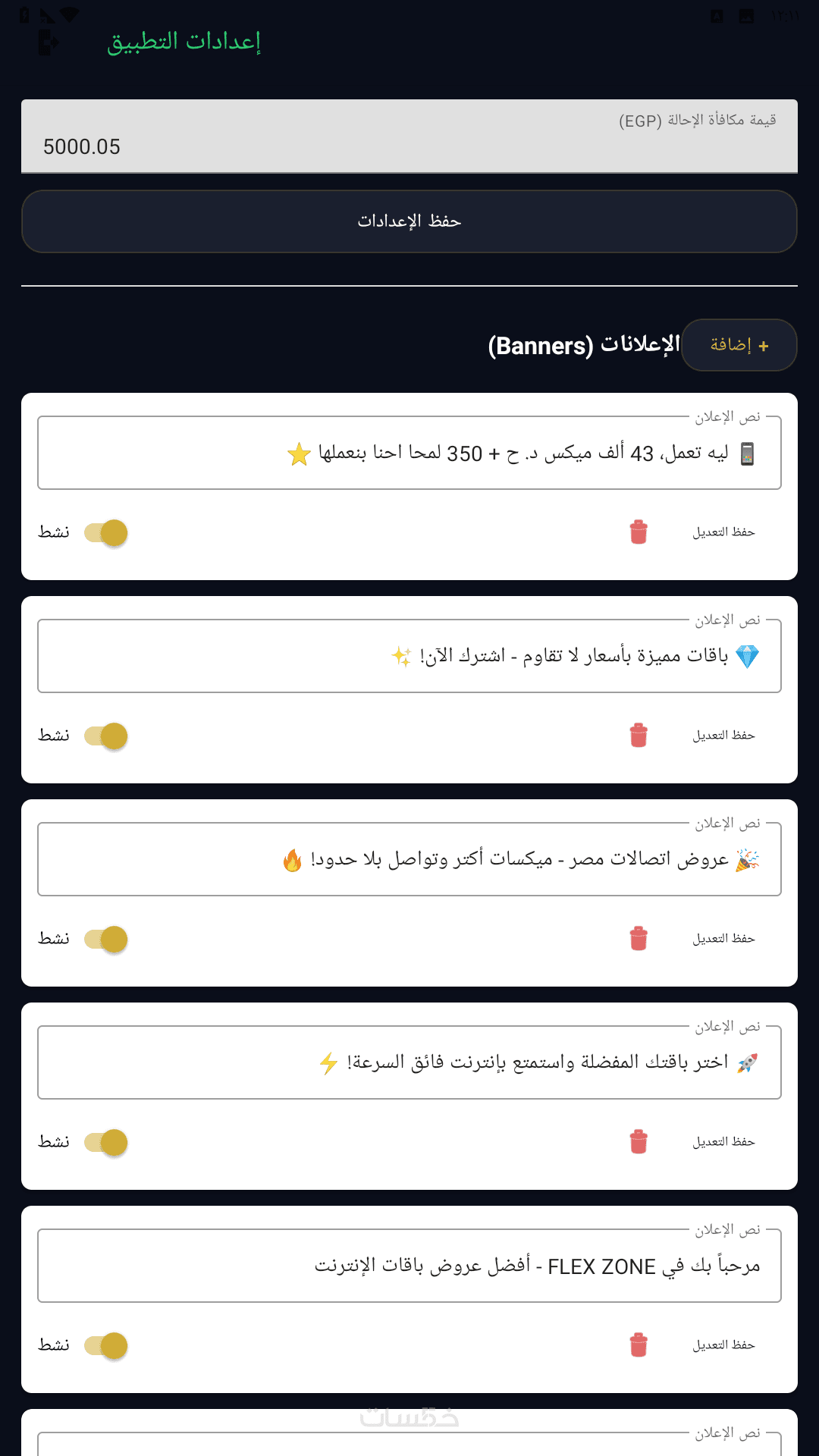 نفس تطبيق المستخدم +زر للدخول الى لوحة الادارة تحتوي ثلاثة شاشة اضافية (ادارة الباقات ، ادارة البنر و رقم التحويل ، شاشة تصميم باقة جديدة (سكربت))