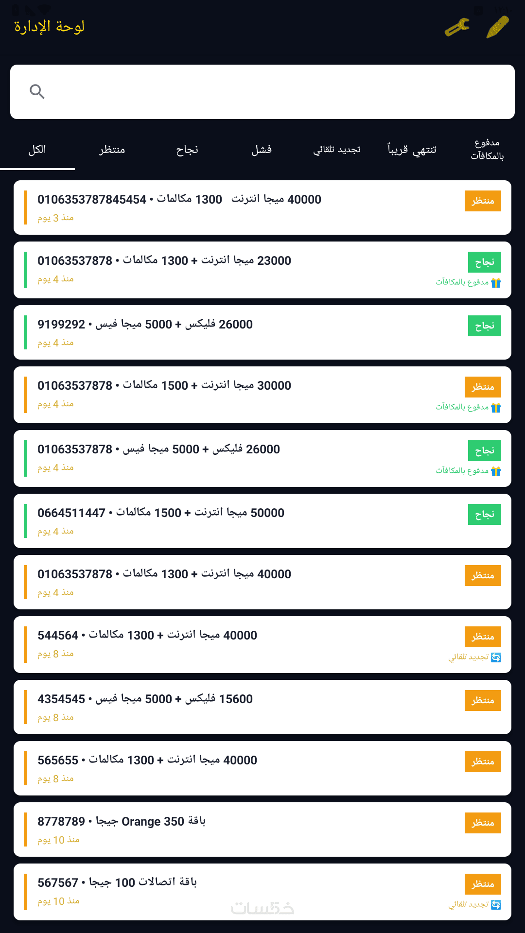 إدارة الطلبات: مراقبة كافة الطلبات الواردة، مراجعة صور التحويل، وتغيير حالة الطلب بضغطة زر.
