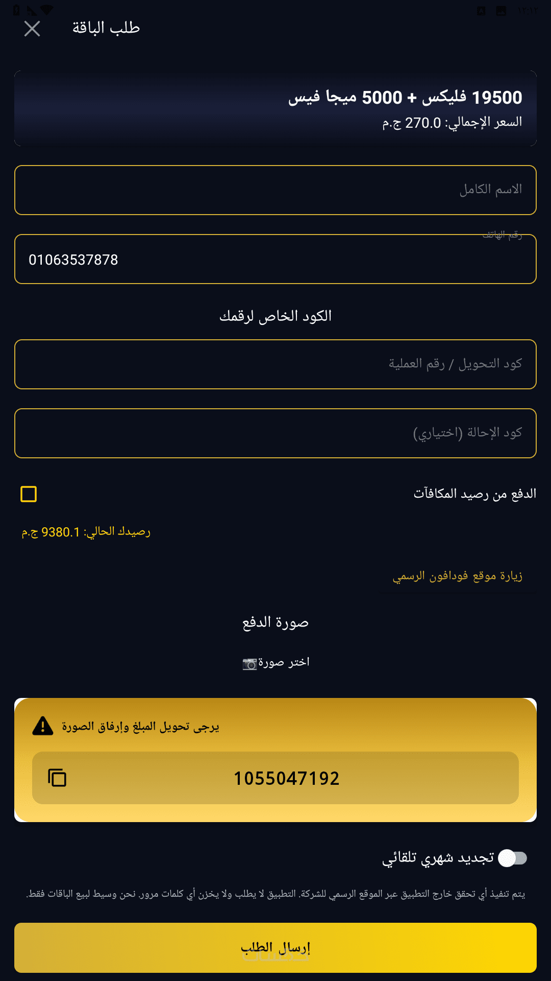 نظام طلبات متكامل: يتضمن إدخال البيانات الشخصية، رقم الهاتف، كود التحويل، ورفع صورة "سكرين شوت" للحوالة لضمان التوثيق.