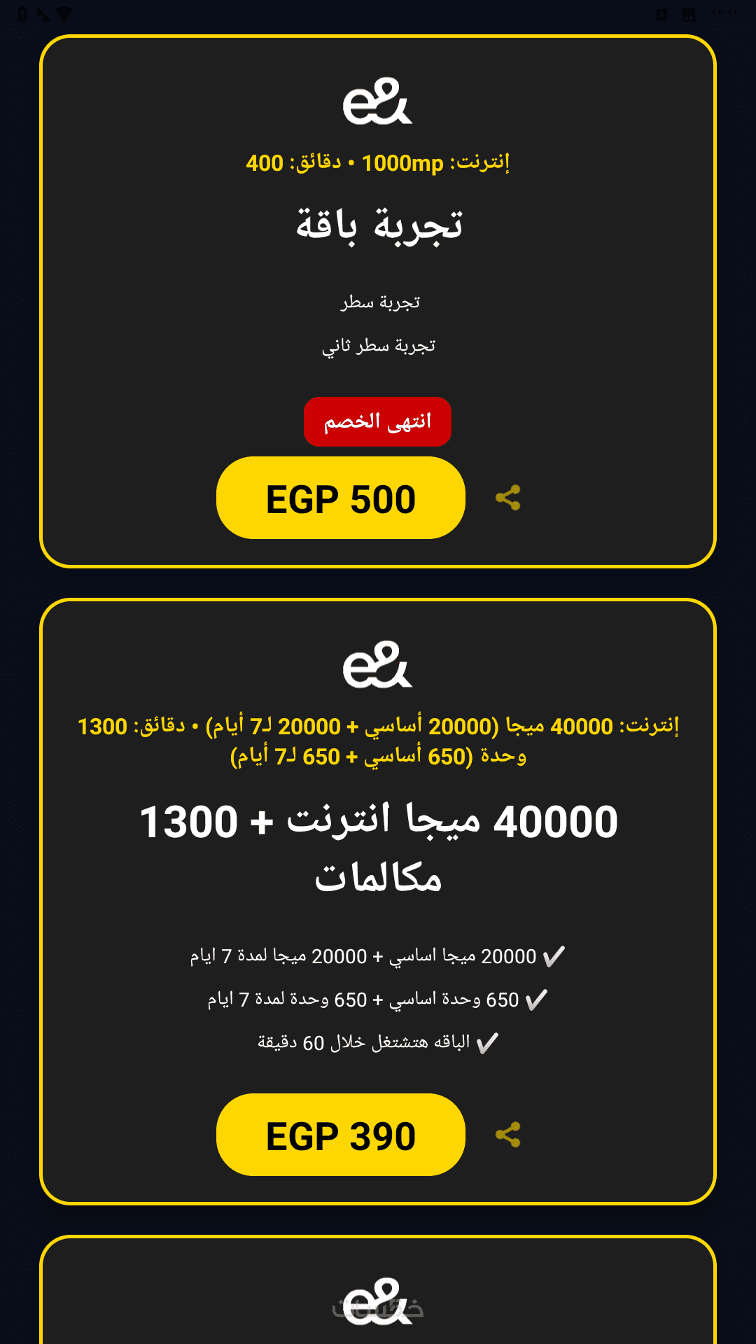 تفاصيل باقات دقيقة: عرض حجم الإنترنت، الدقائق، والسعر، مع إمكانية عرض "شارات" خصم وعروض لفترة محدودة.