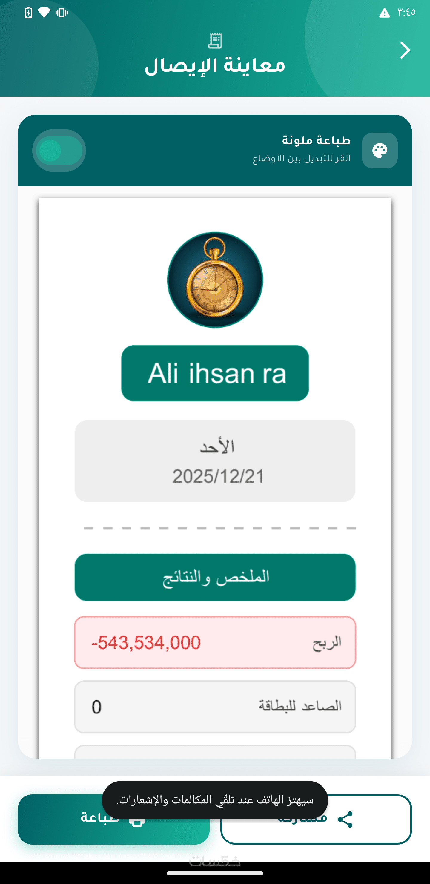 معاينة التقرير على شكل إيصال مالي
