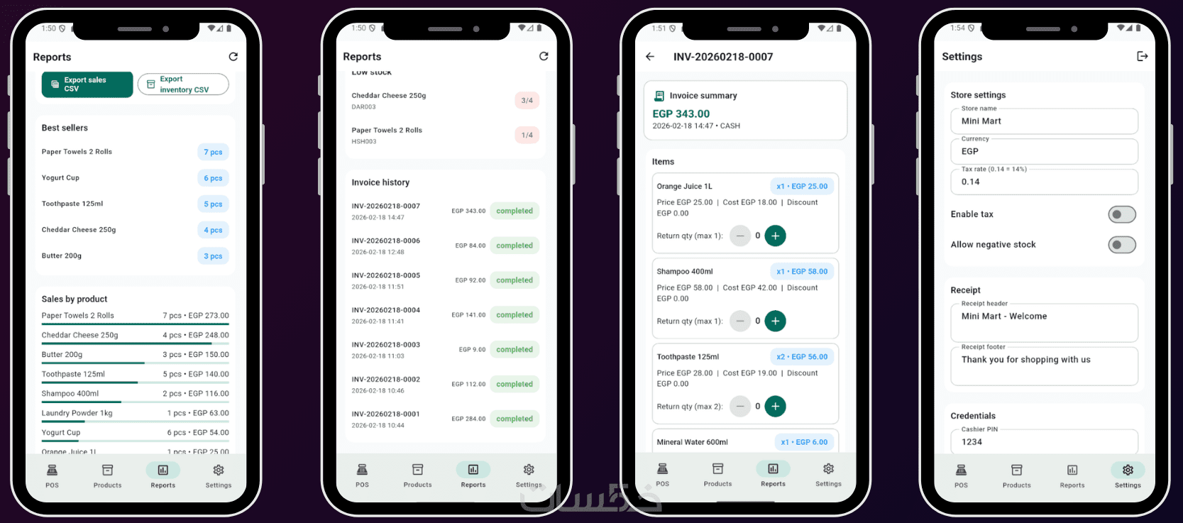 - Barcode Scanner: قراءة الباركود واستخراج بيانات المنتج وعرضها داخل التطبيق.