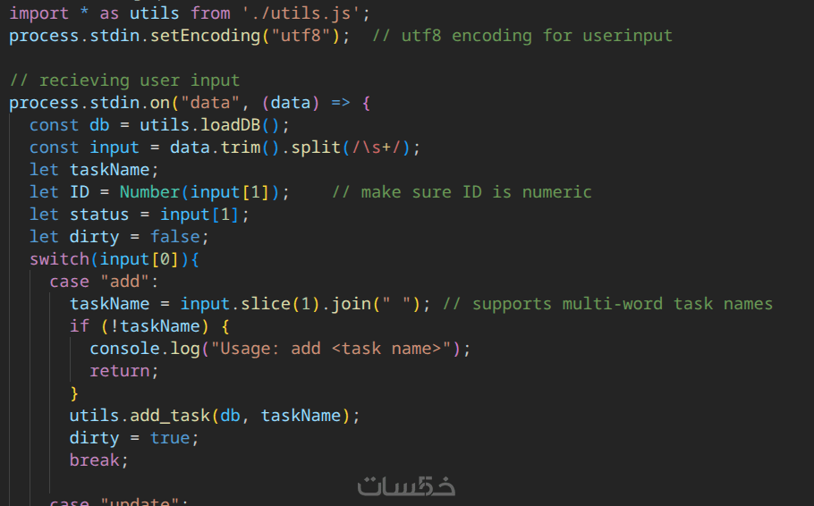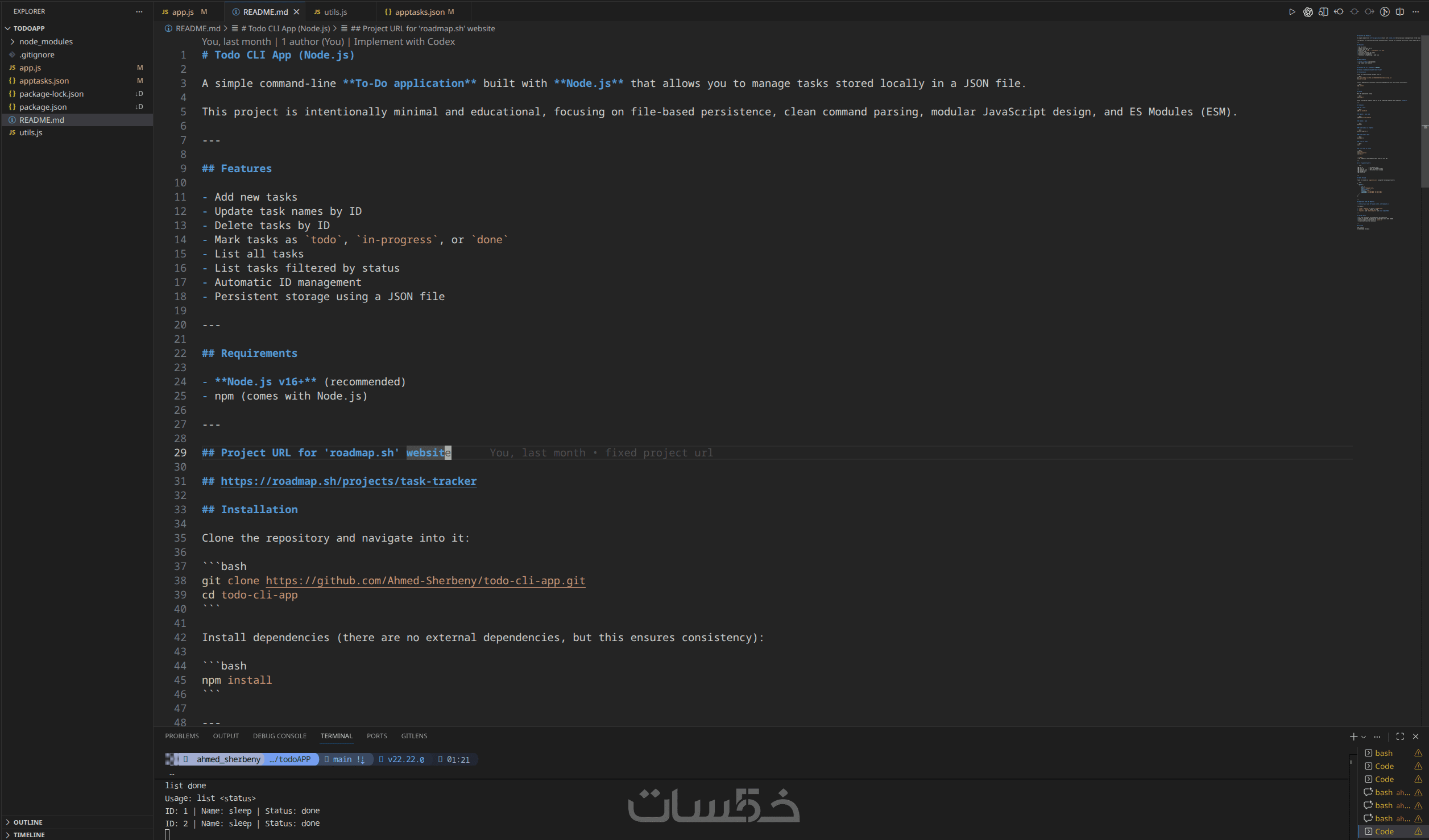 جدول مهام لك ليسهل تذكرها خلال اليوم، تقوم بادخال اسم المهمة وسيتخزن تلقائيا الوقت واليوم الذي ادخلت المهمة فيه، وتستطيع ان تعدل، وان تمسح وان تعلم على مهمة اذا اتممتها او تقوم بها حاليا. تستطيع ايضا استرجاع جميع المهام المخزنة، او بعض من المهمام بناء على حالتها مثل المهام المنتهية او التي جاري العمل عليها. المشروع صغير نسبيا وبه 4 ملفات، ملفين كود مصدري بصيغة js. وفايل JSON وفايل README وغير مستخدم فيه مكتبات من جهة خارجية.