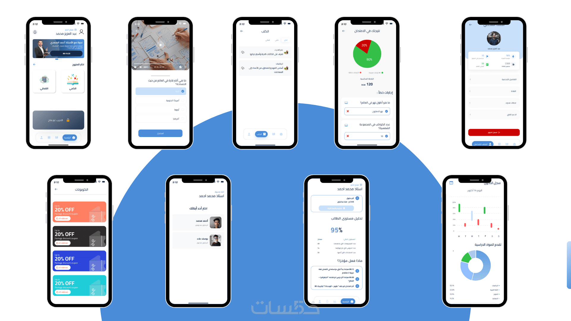 • لوحة تحكم: تعرض إحصائيات وتقارير توضح أداء الطالب في المواد المختلفة.