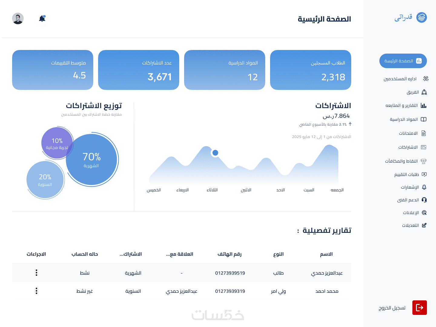 • توفير لوحة تحكم تحتوي على تقارير وإحصائيات واضحة عن أداء الطالب.