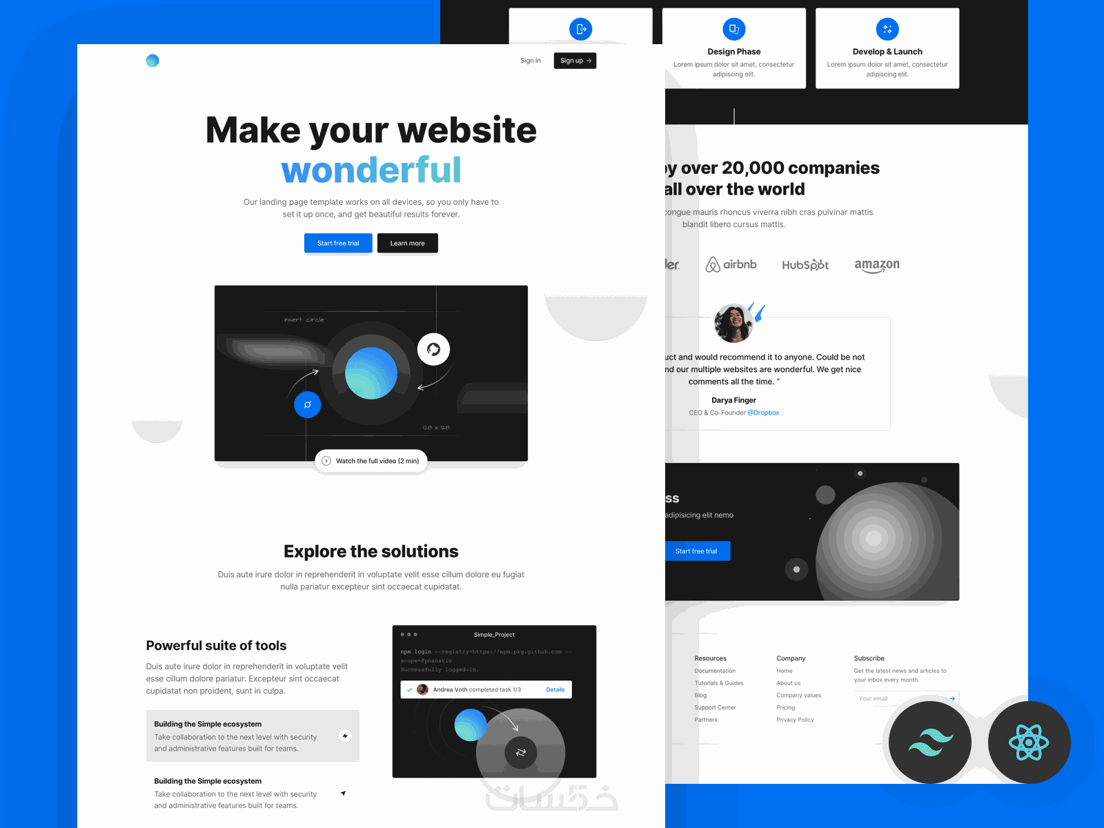 ستستلم مشروع React يحتوي على صفحة هبوط مبرمجة بالكامل باستخدام React وTailwind CSS، مطابقة للتصميم الذي تزودني به.