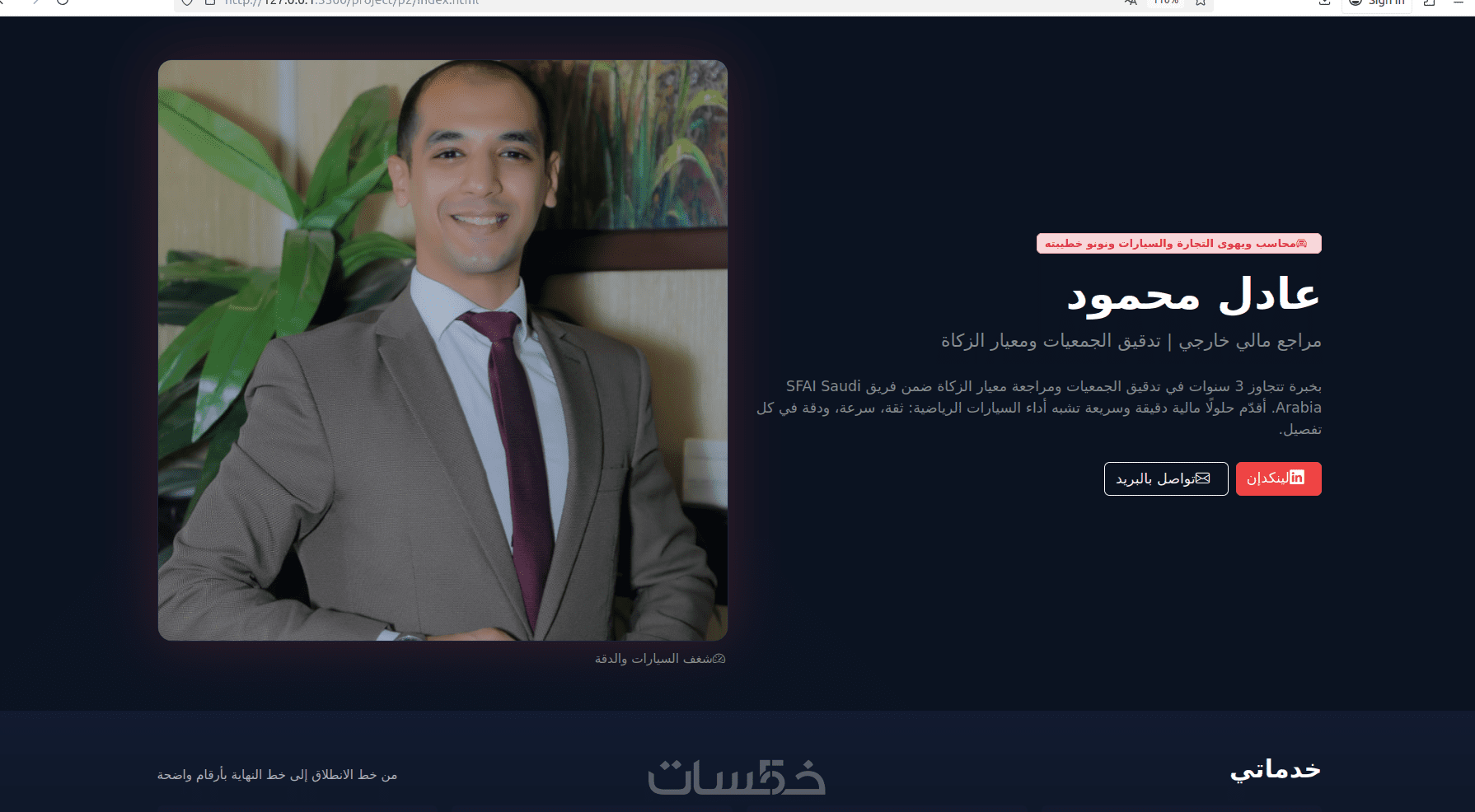 تحتوي على جزء تعريفي وصورة شخصية يليها قسم خدمات التي تقدمها وقسم ستضمن الخبرات - وسائل التواصل -ابرز الاعمال المنجزة