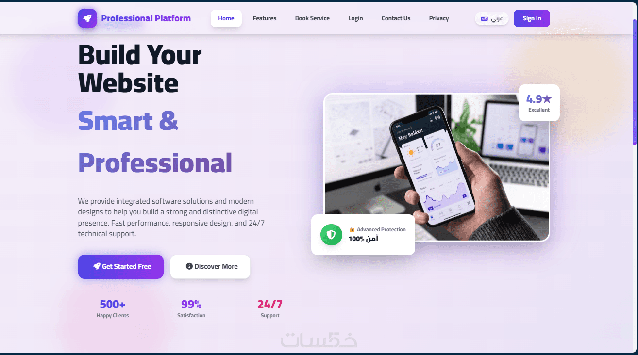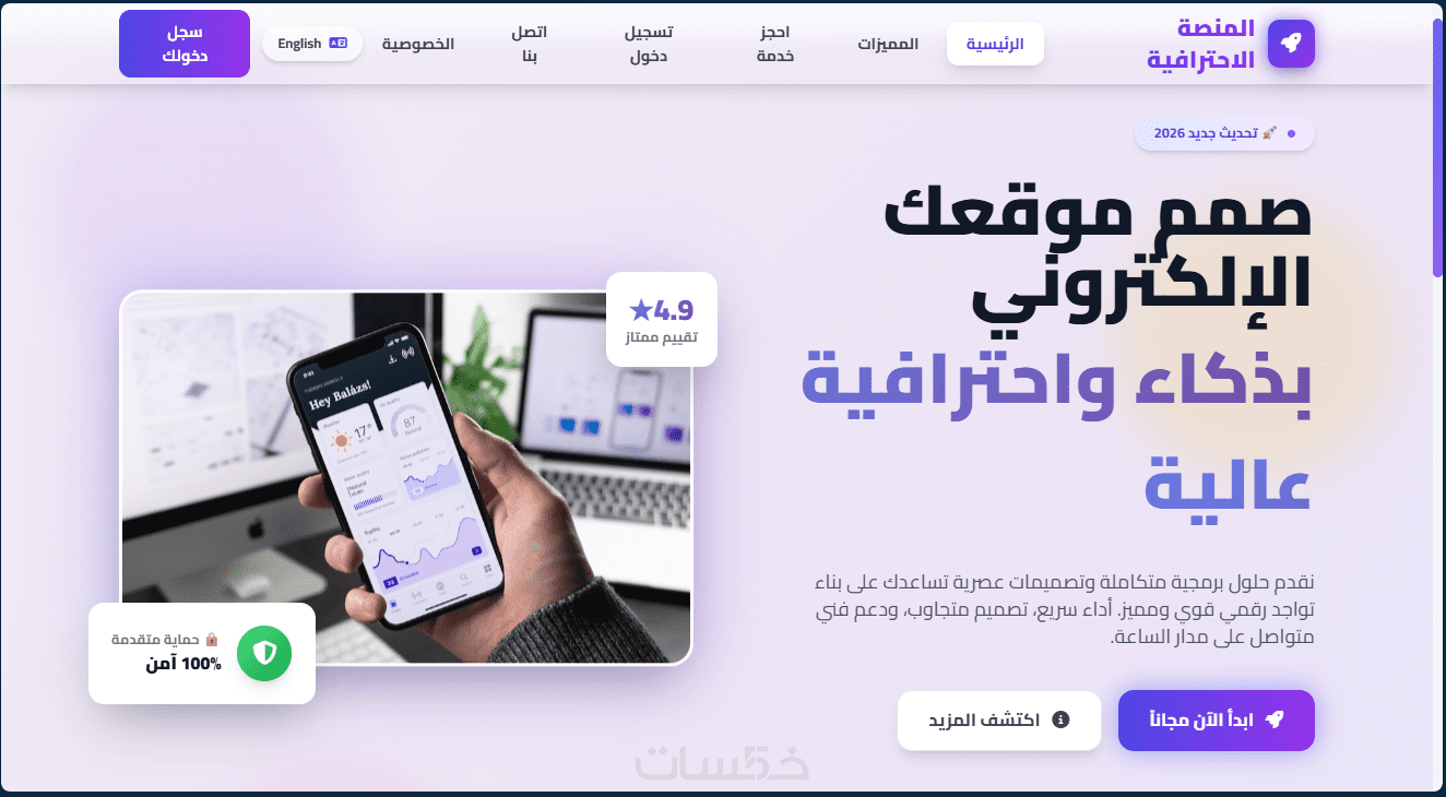 ستحصل في الخدمة الأساسية على تصميم الواجهة الرئيسية (Hero Section) وقسم المميزات.