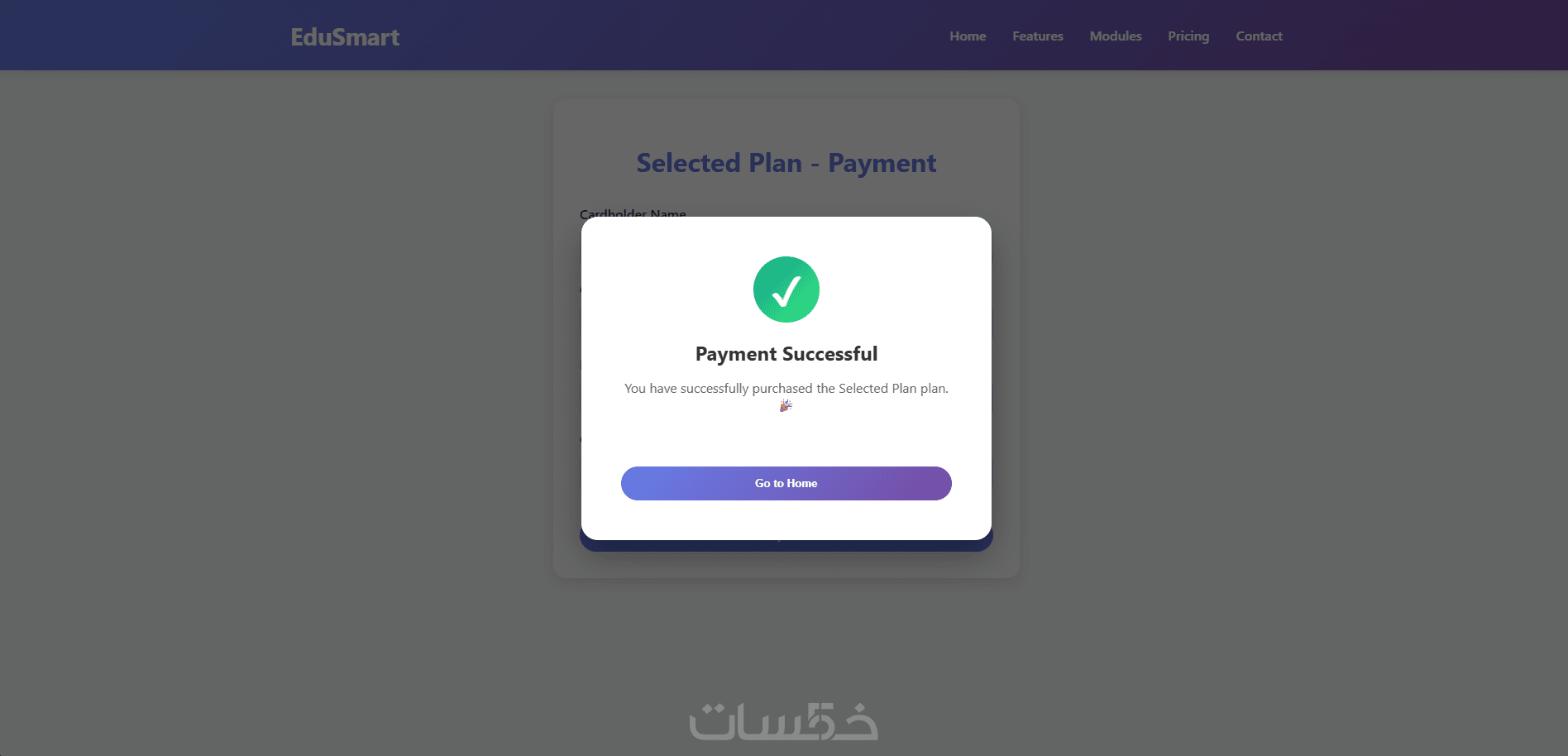 صفحة خطط اشتراك ودفع مع رسالة نجاح