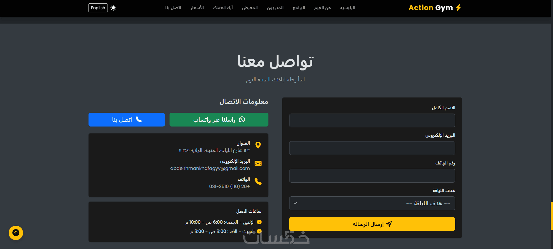 صفحة تواصل معنا (نموذج + واتساب + اتصال)