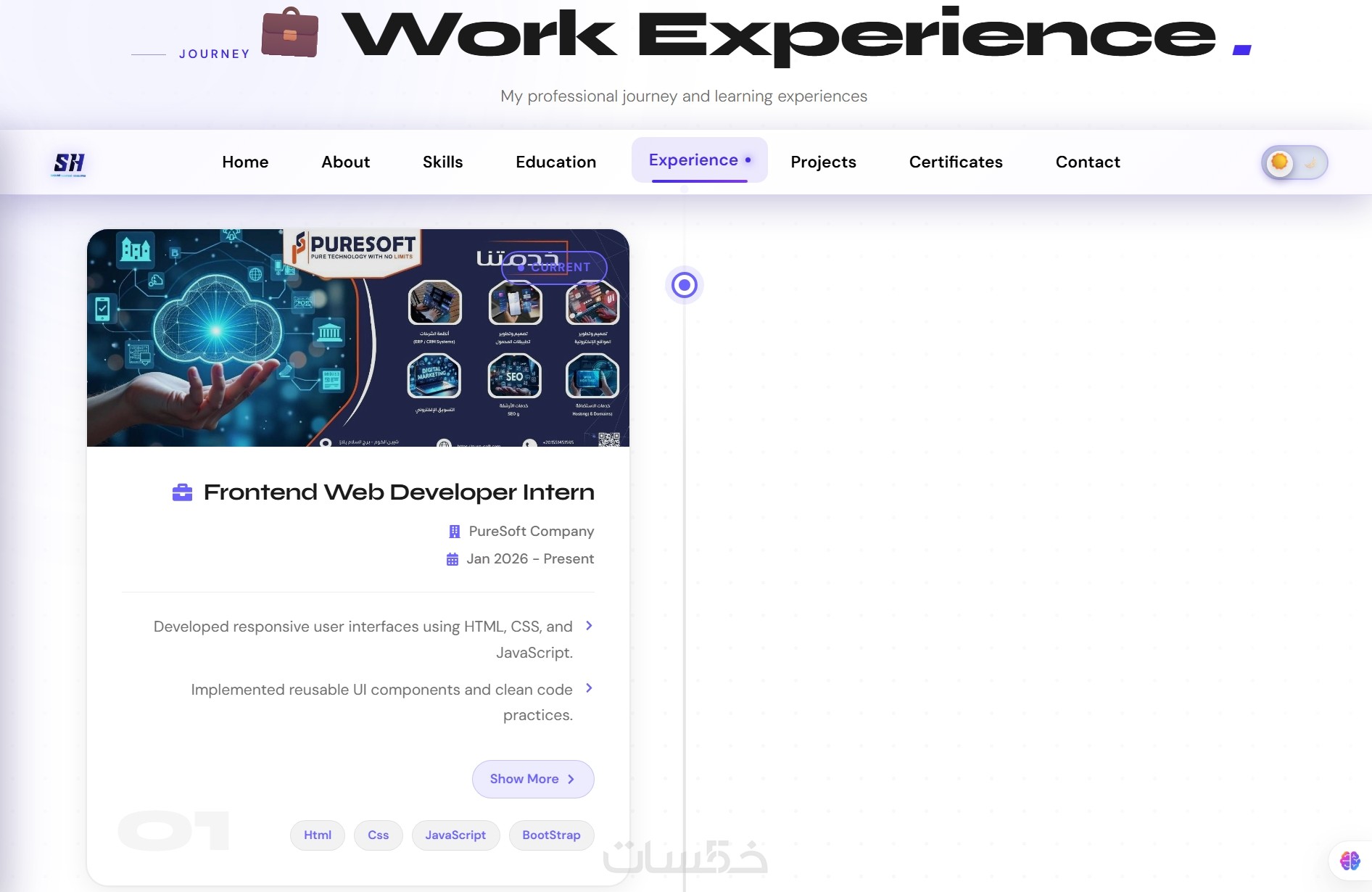 الموقع عبارة عن صفحة واحدة (Single Page) منظمة إلى أقسام احترافية، مع دعم الوضع الليلي والنهاري وتجربة مستخدم سلسة وسرعة تحميل عالية، ليعكس هويتك المهنية بشكل عصري واحترافي.