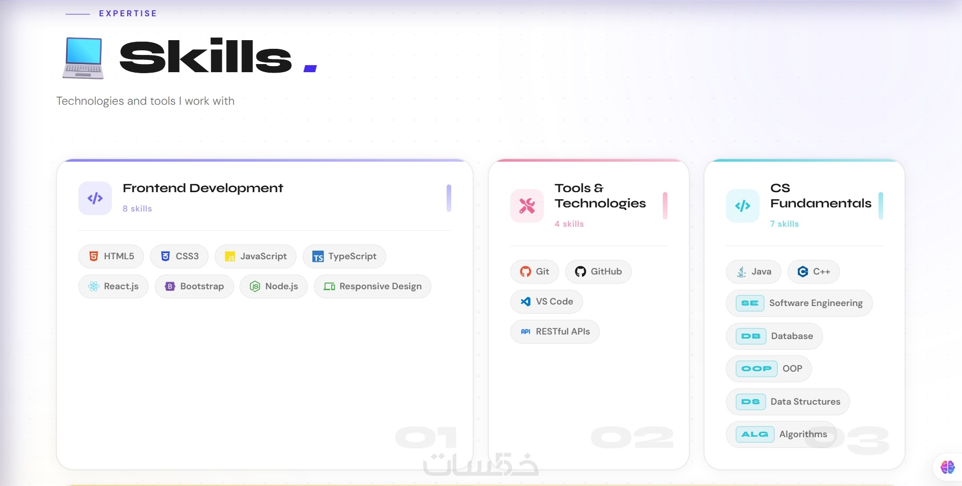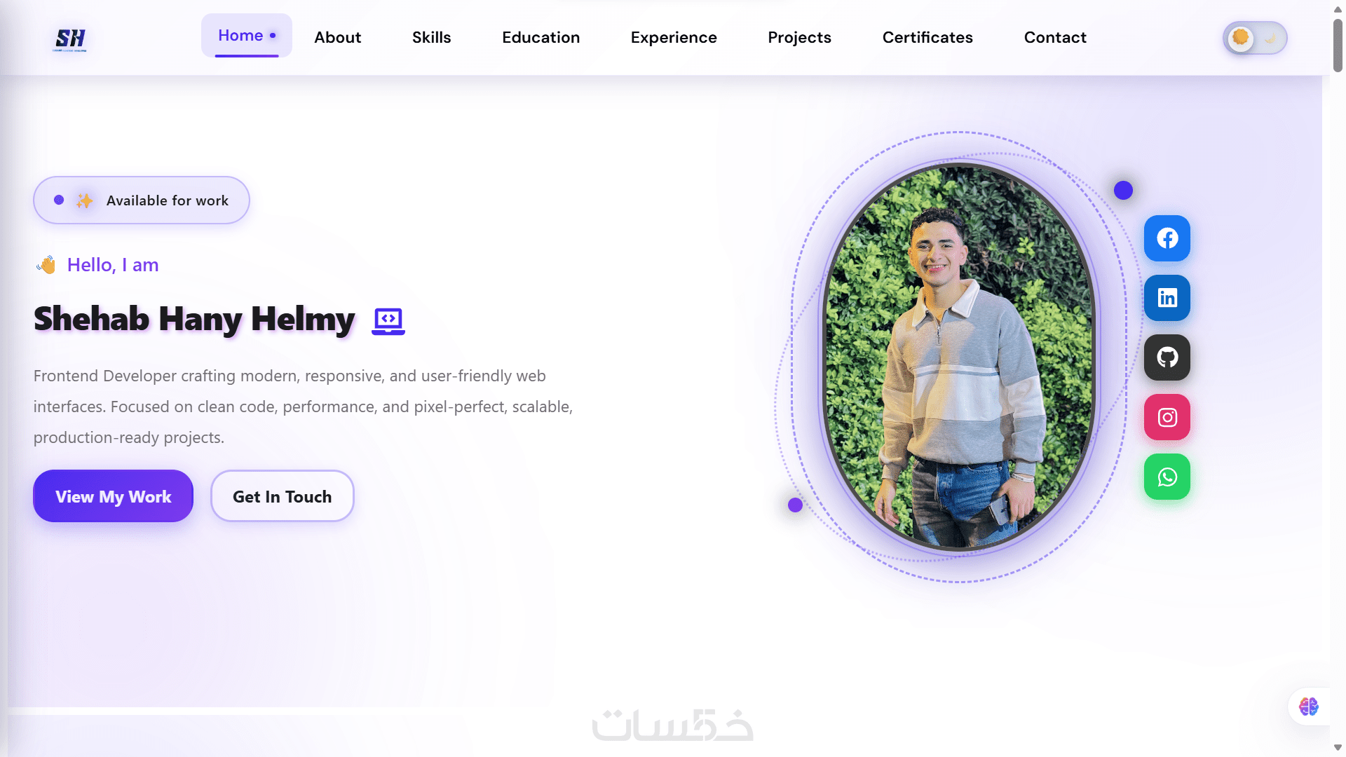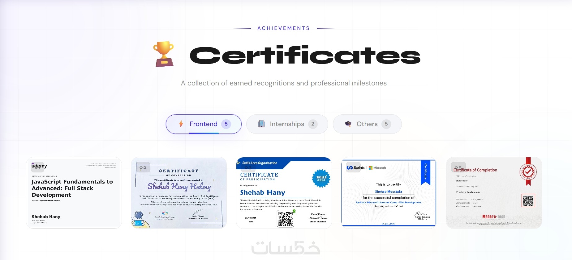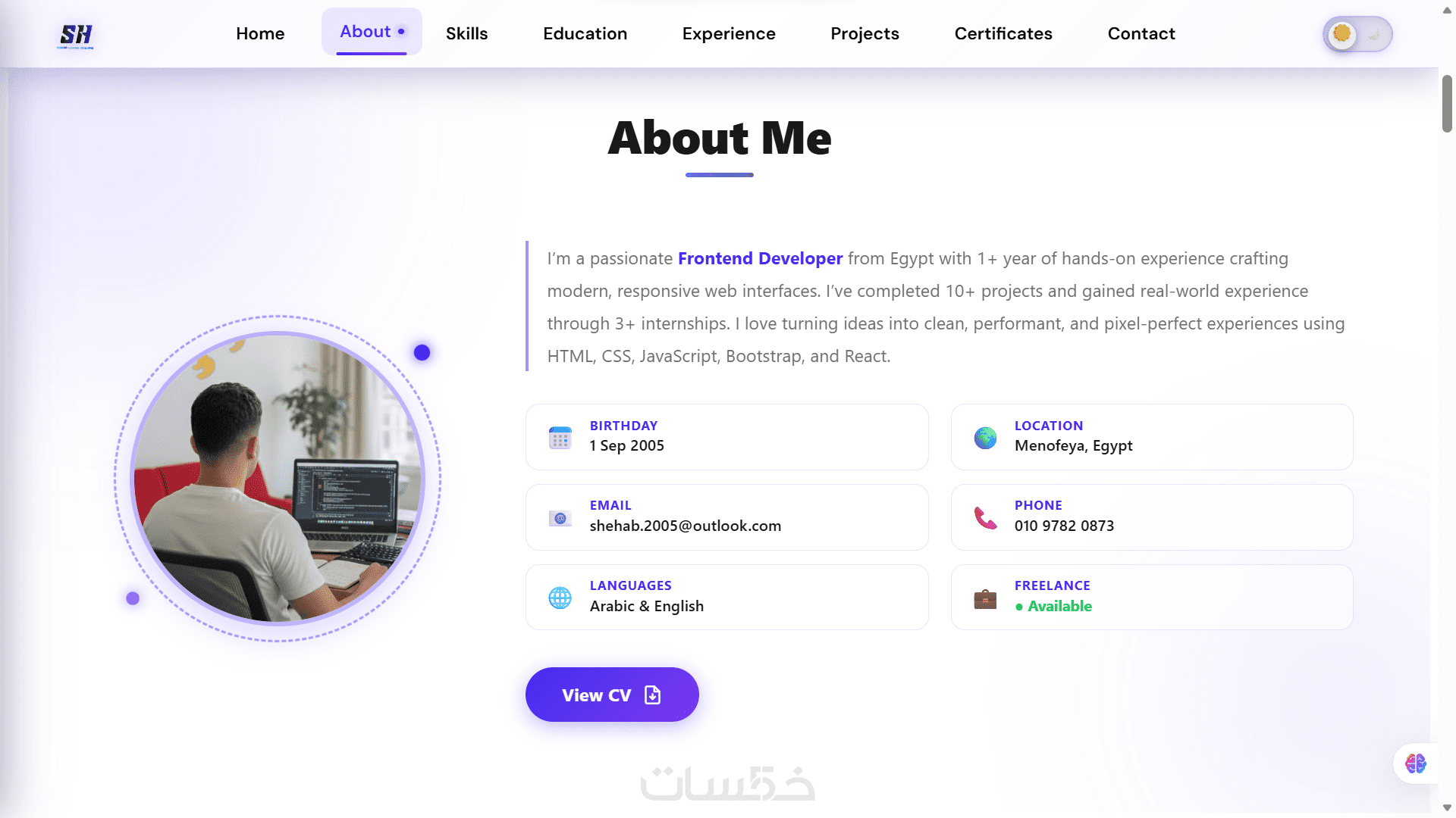 جميع أقسام البورتفوليو (Hero – About – Skills – Projects – Education – Certificates – Contact)