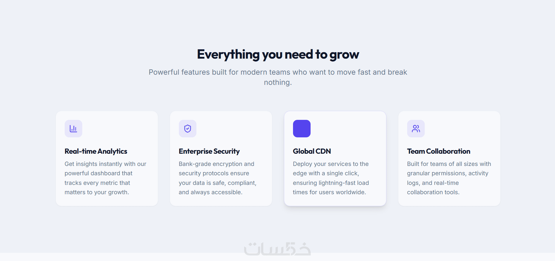 قسم المميزات/الخدمات (Features/Services): عرض مميزات منتجك أو خدمتك بشكل منظم وأيقونات عصرية.