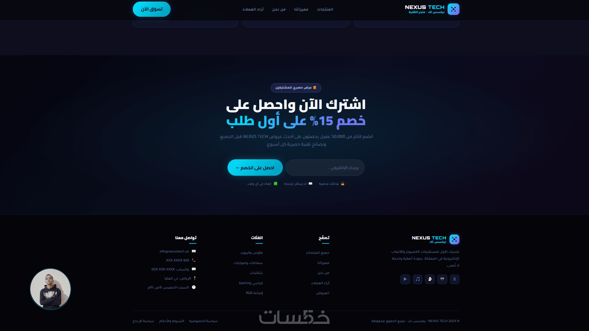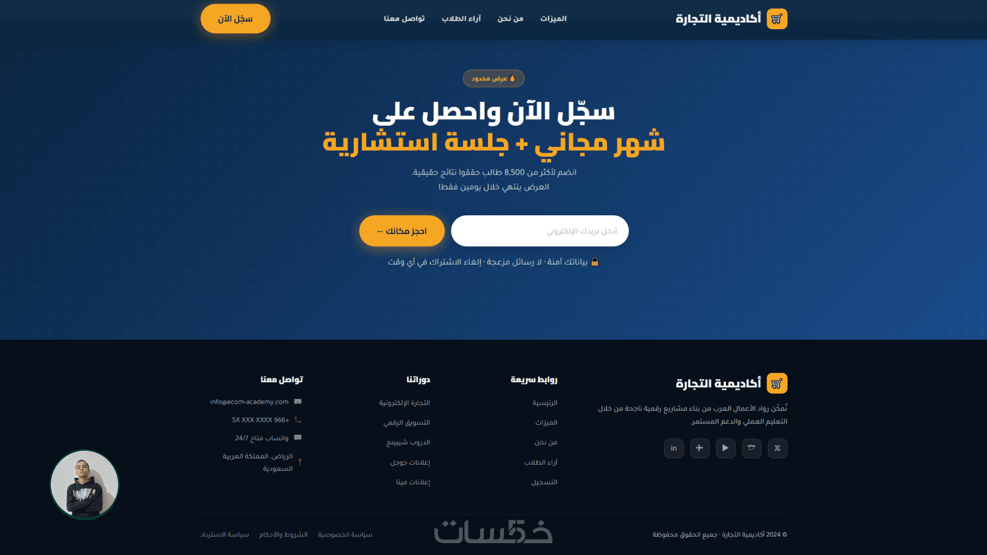 تذييل (Footer) يحتوي على روابط التواصل وسياسات الموقع.