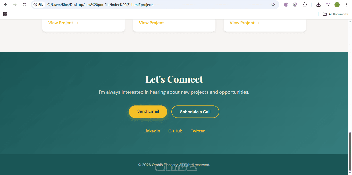 مرحبًا، أنا أمنية طه، مطورة مواقع إلكترونية ومتخصصة في تصميم وتطوير صفحات البورتفوليو الشخصية للشركات والأفراد، بخبرة واسعة في هذا المجال.