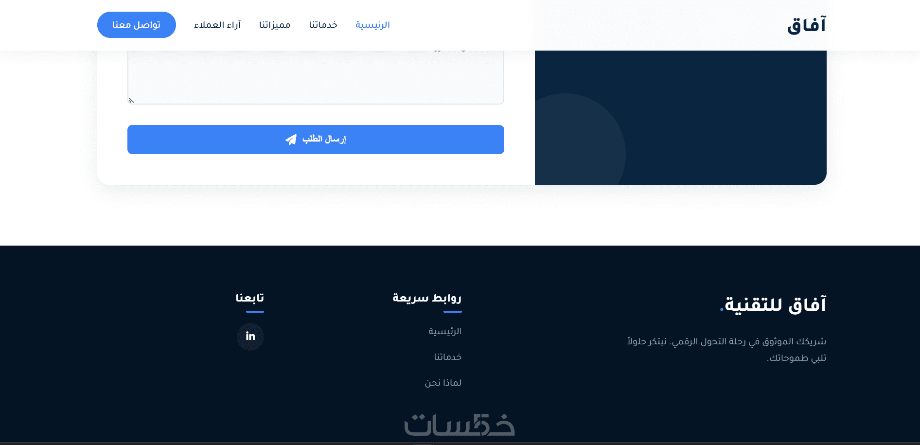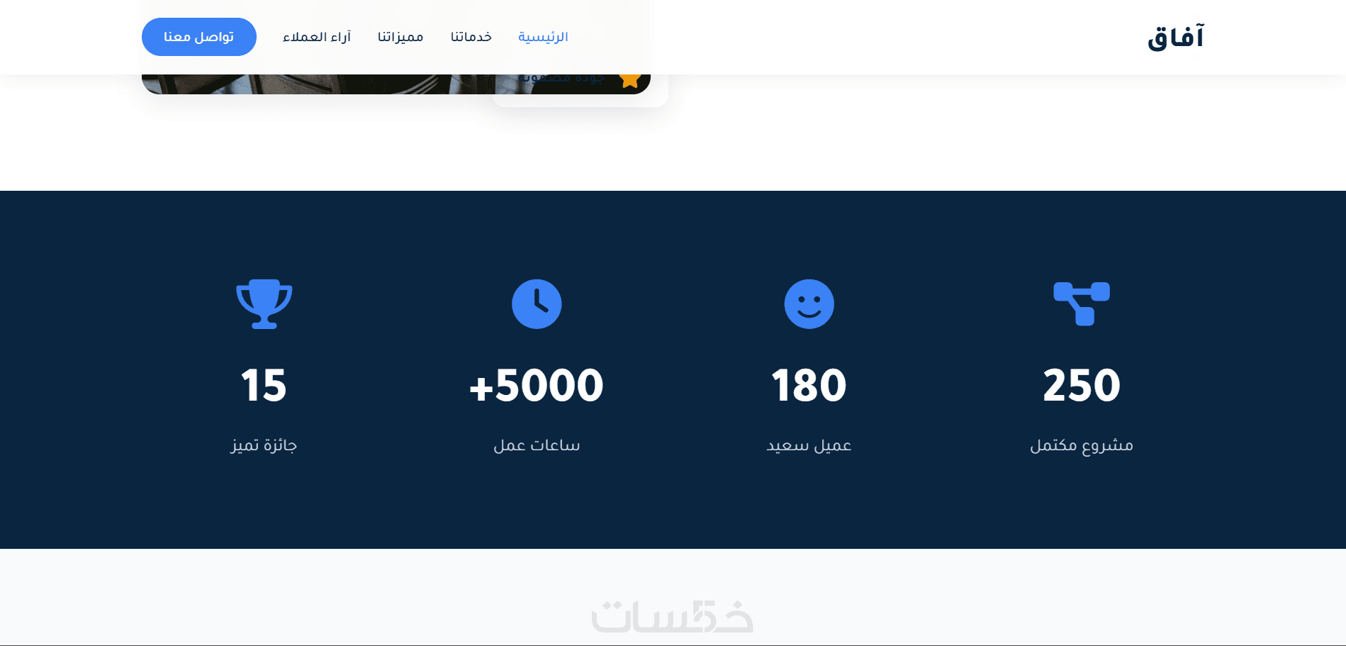 أقدم لك خدمة تصميم وتطوير Landing Page حديثة وجذابة مستوحاة من تصميم موقع “آفاق للتقنية”، تُظهر مشروعك بأسلوب احترافي وتعرض خدماتك بطريقة واضحة ومقنعة. الصفحة مصممة لتحقيق هدف واحد واضح وهو زيادة التفاعل مع عملائك ورفع معدلات التحويل