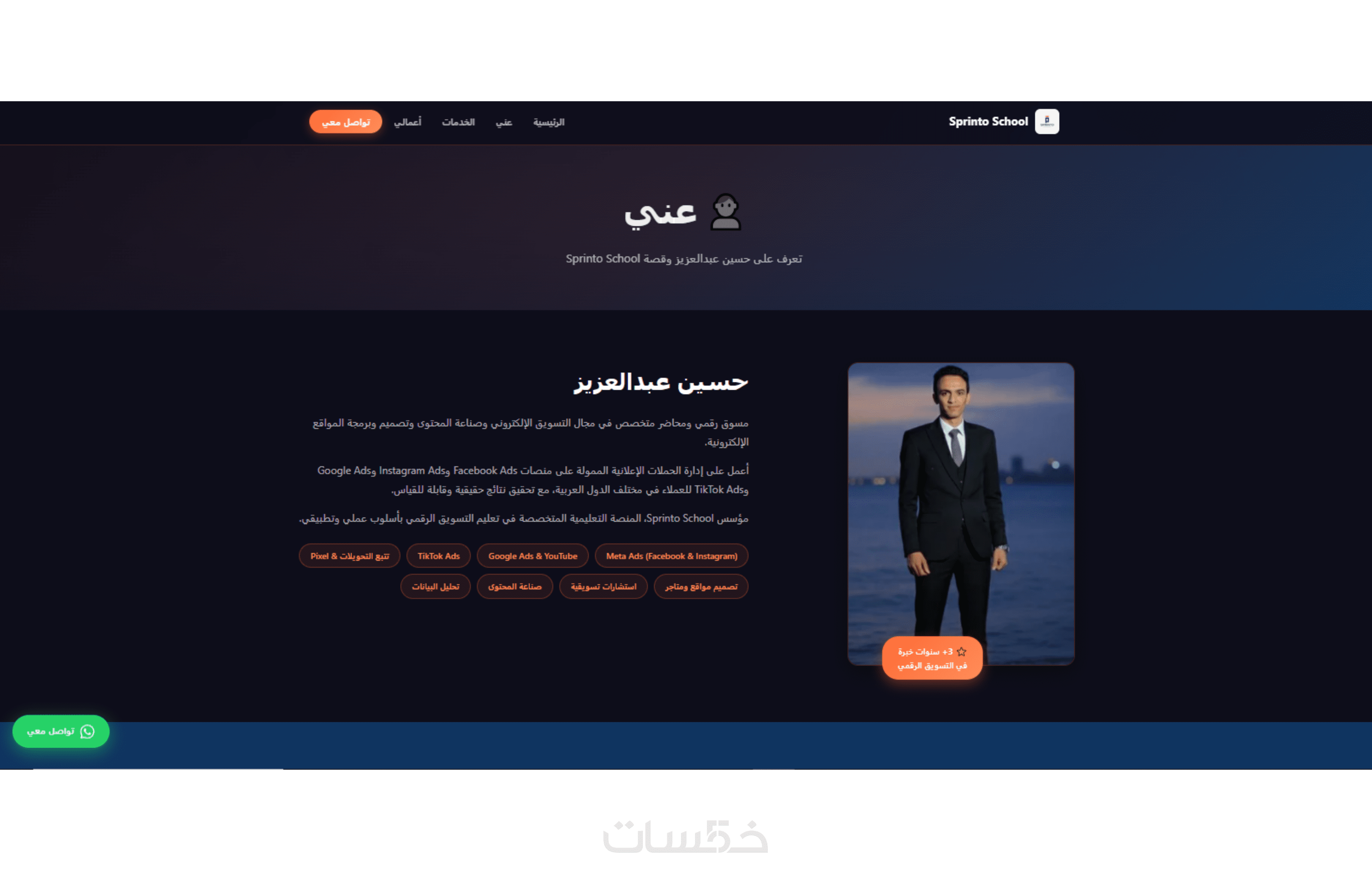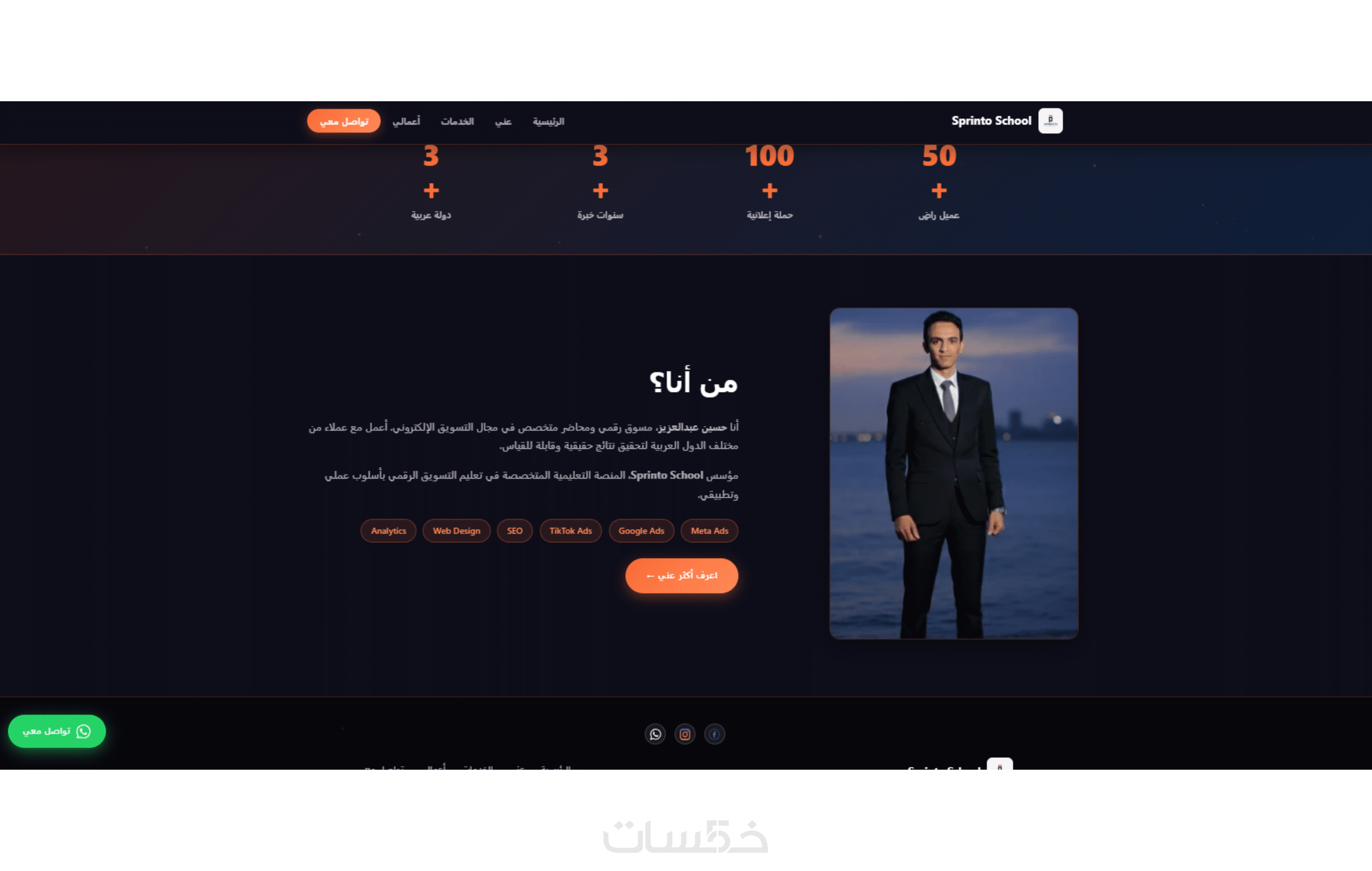 يحتوي الموقع على أقسام أساسية منظمة تشمل (من أنا – معرض الأعمال – الخدمات – تواصل معنا) لعرض معلوماتك وخبراتك بشكل واضح وسهل التصفح للزائر