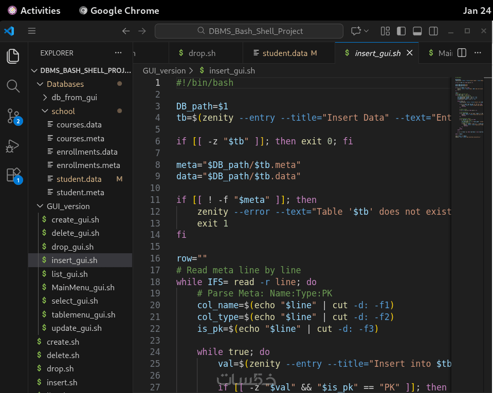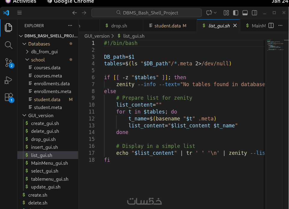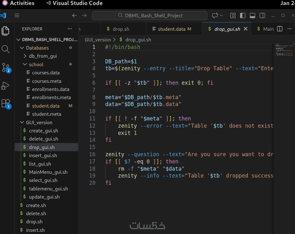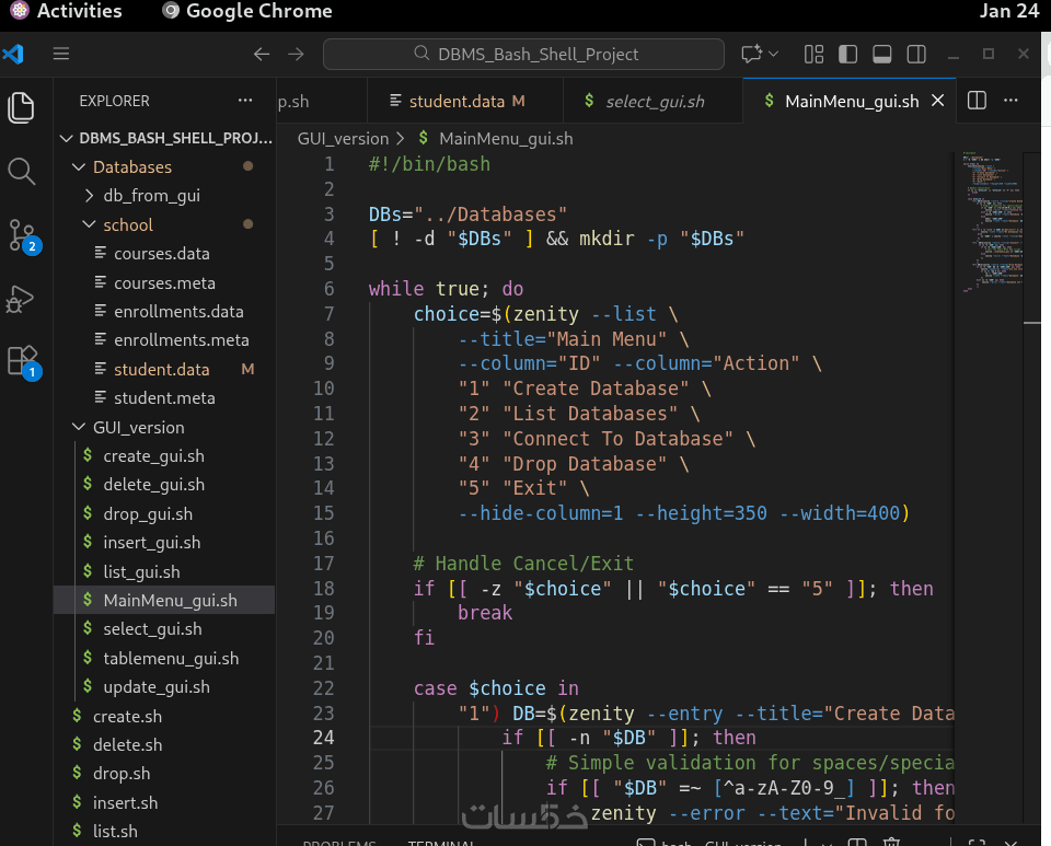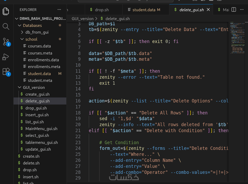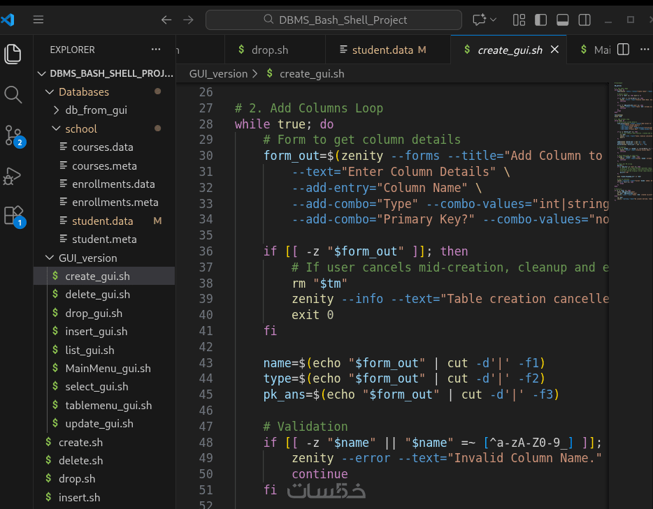 تطوير سكربتات Bash لتنفيذ وظائف إدارة البيانات مثل إنشاء قواعد البيانات، الجداول، الإدخال، الحذف، والتعديل باستخدام الملفات النصية.