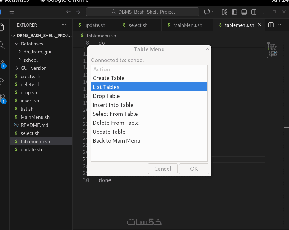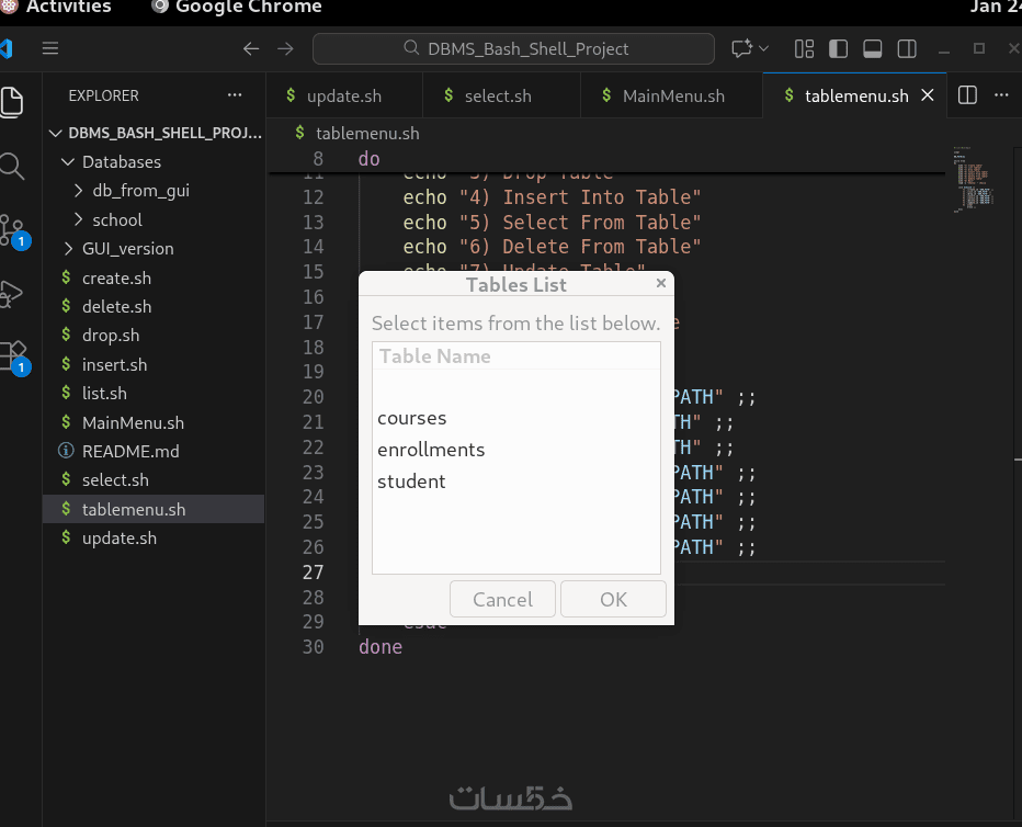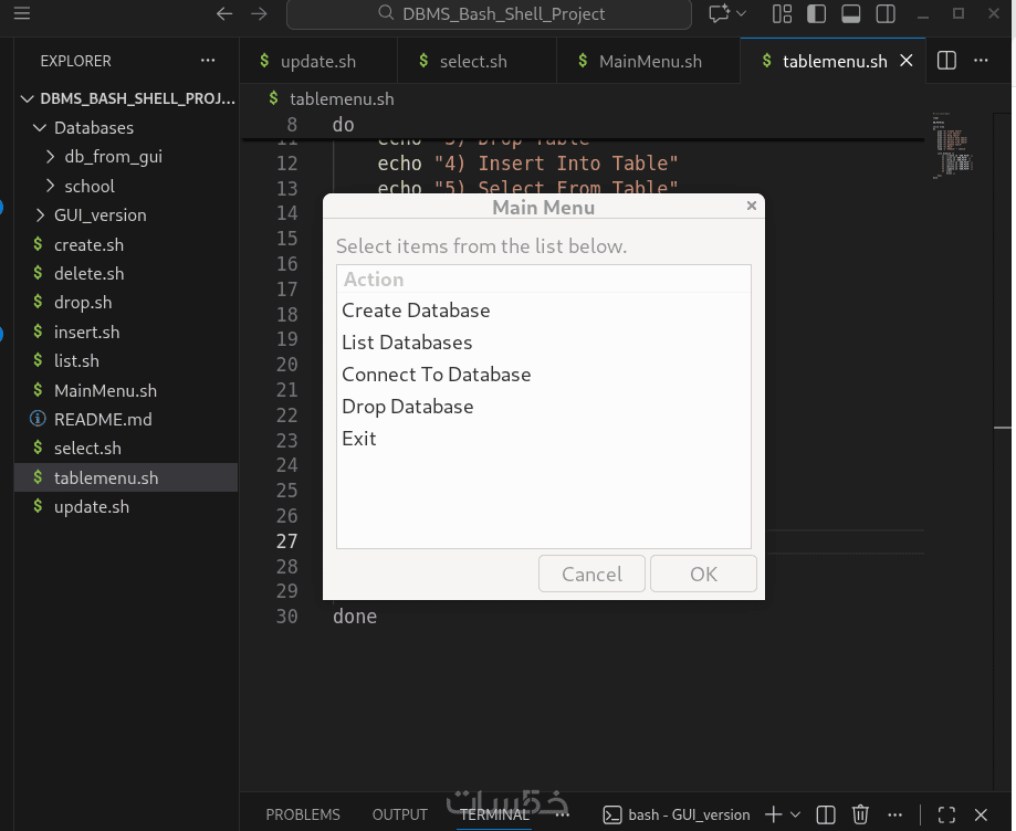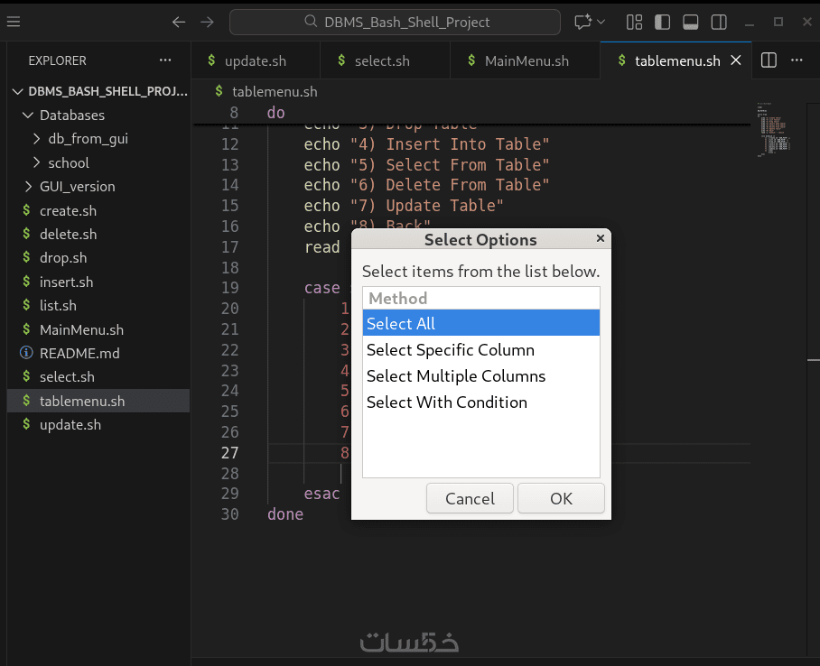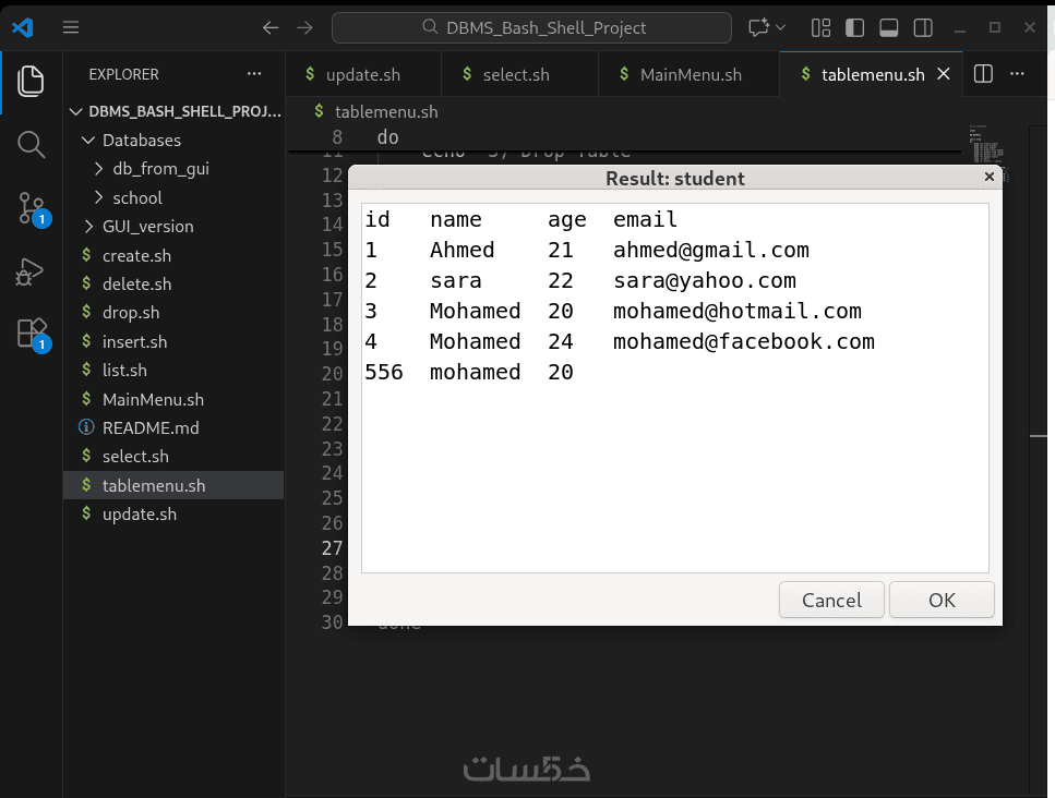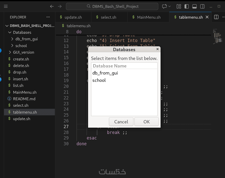 تطوير سكربتات Bash لتنفيذ وظائف إدارة البيانات مثل إنشاء قواعد البيانات، الجداول، الإدخال، الحذف، والتعديل باستخدام الملفات النصية.