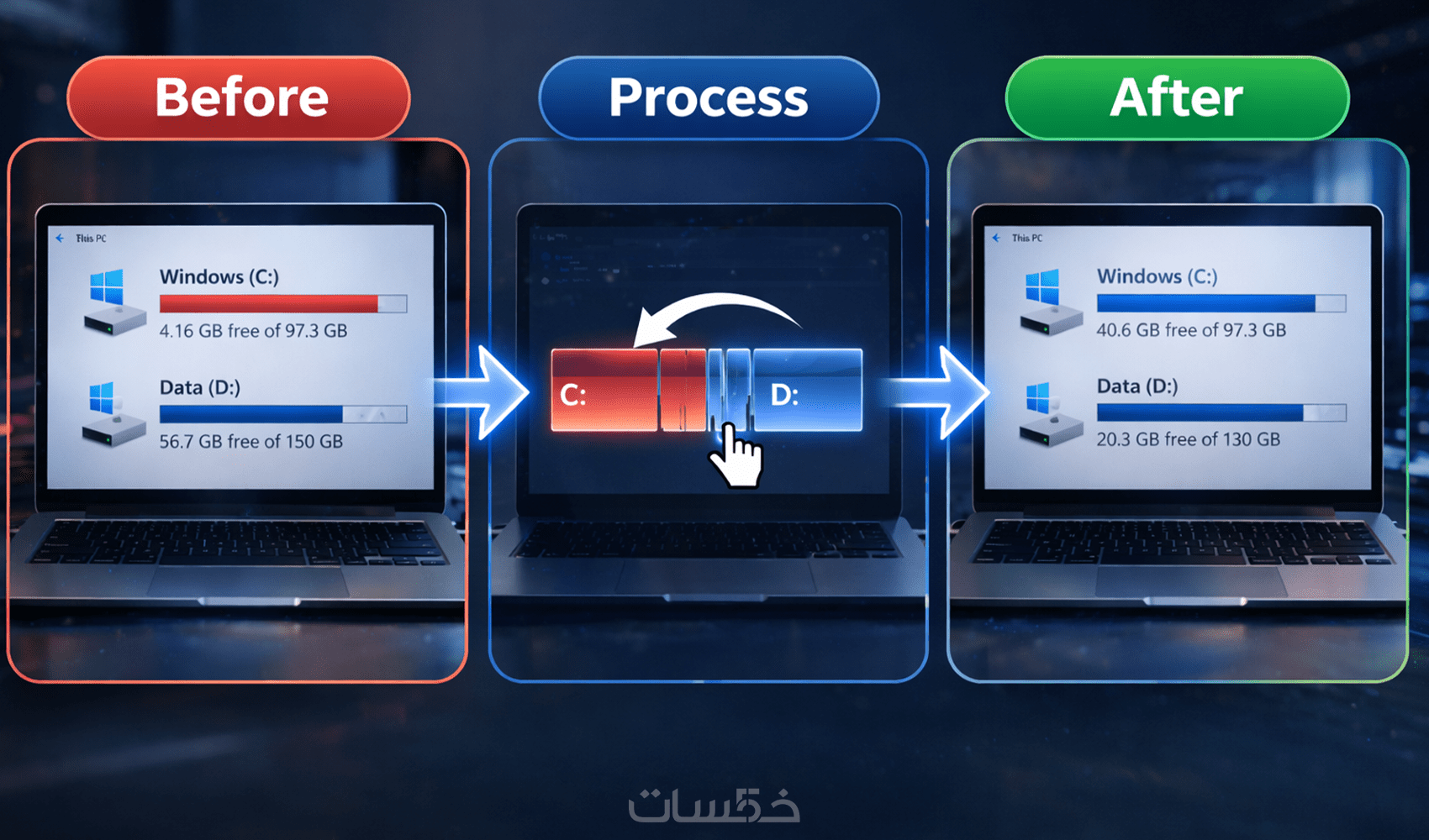 زيادة مساحة قرص C لجهاز واحد حسب المساحة المتوفرة وإمكانية التقسيم