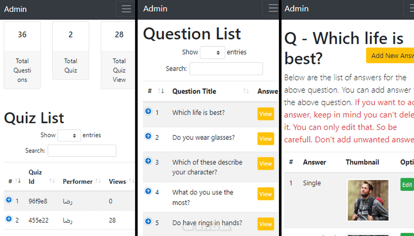 2- صفحة إدارة الموقع بإمكانك إضافة أسئلة من إختيارك مرفوقة بالصور من إختيارك - إضافة أجوبة لها من إختيارك.