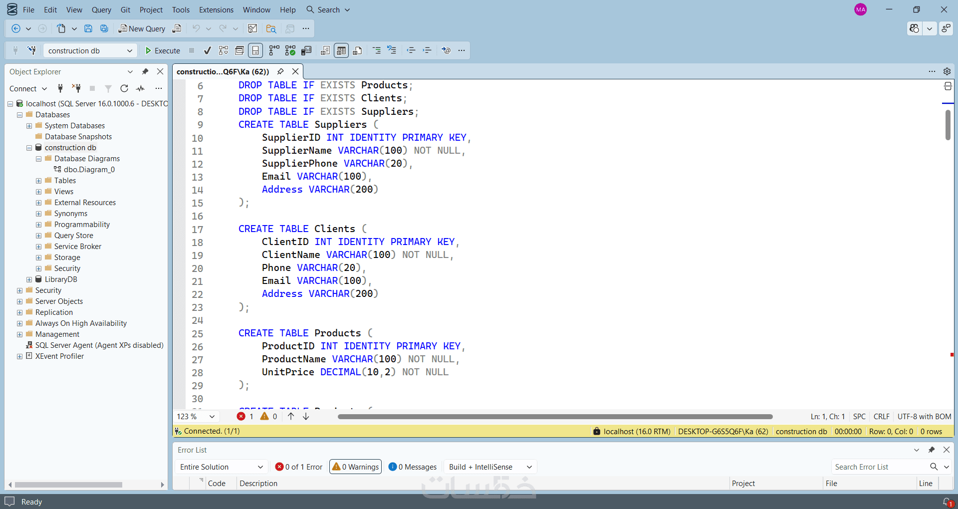 - كتابة سكربت SQL لإنشاء الجداول مع المفاتيح الرئيسية والخارجية .