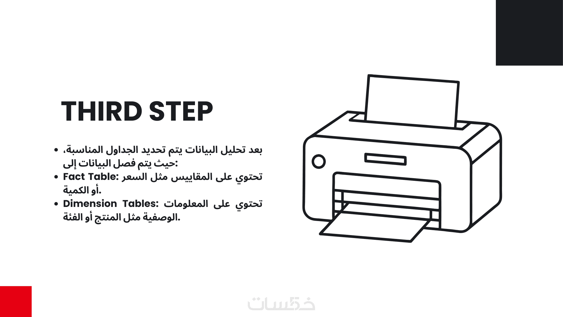 مثال: جدول العملاء (Customers)، جدول المنتجات (Products)، جدول الوقت/التاريخ (Date/Time)، جدول الفئة (Category)، جدول الموقع (Location) إذا لزم الأمر.