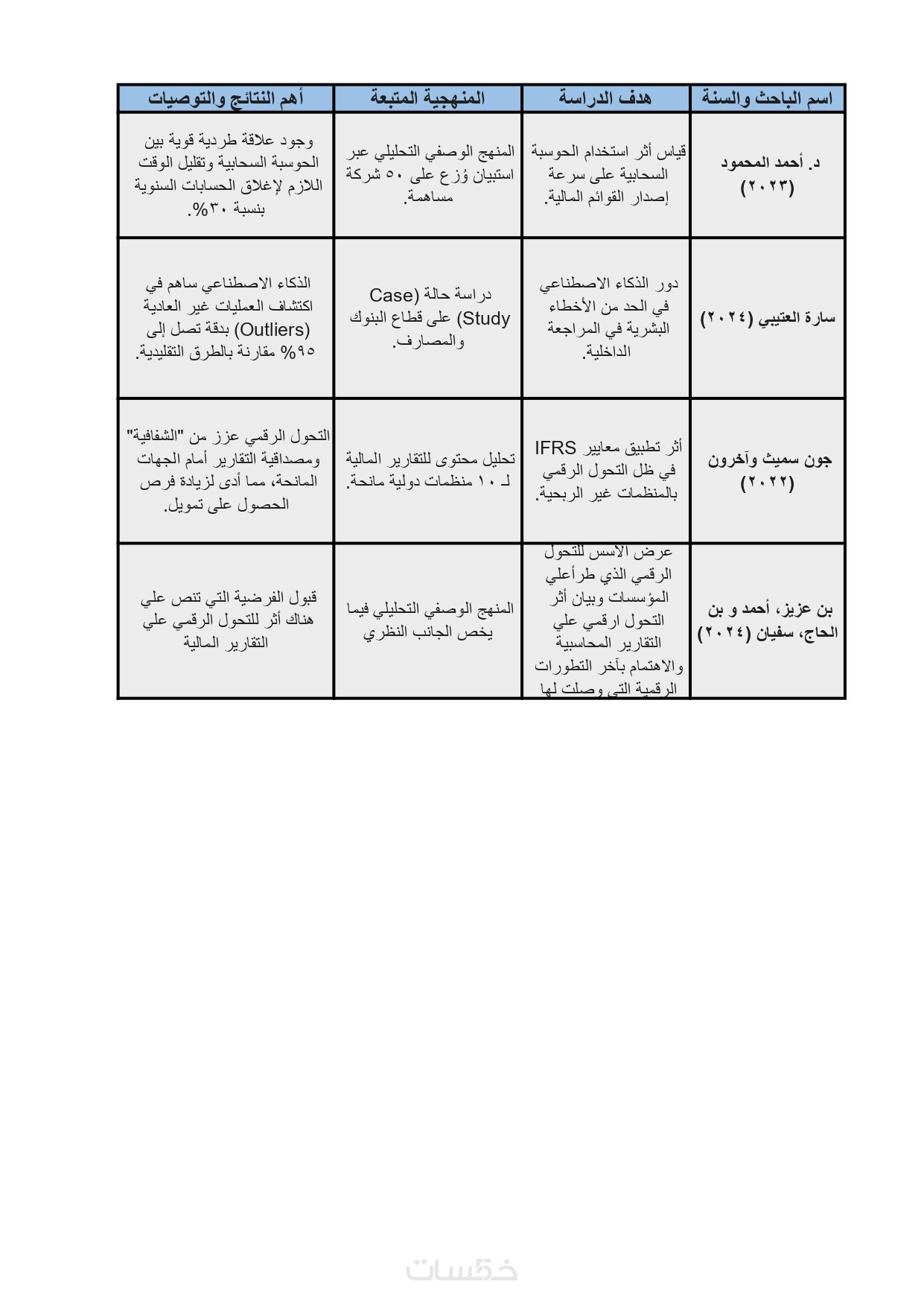 تلخيص 5 دراسات سابقة في جدول مقارنة (المؤلف - السنه - النتائج)