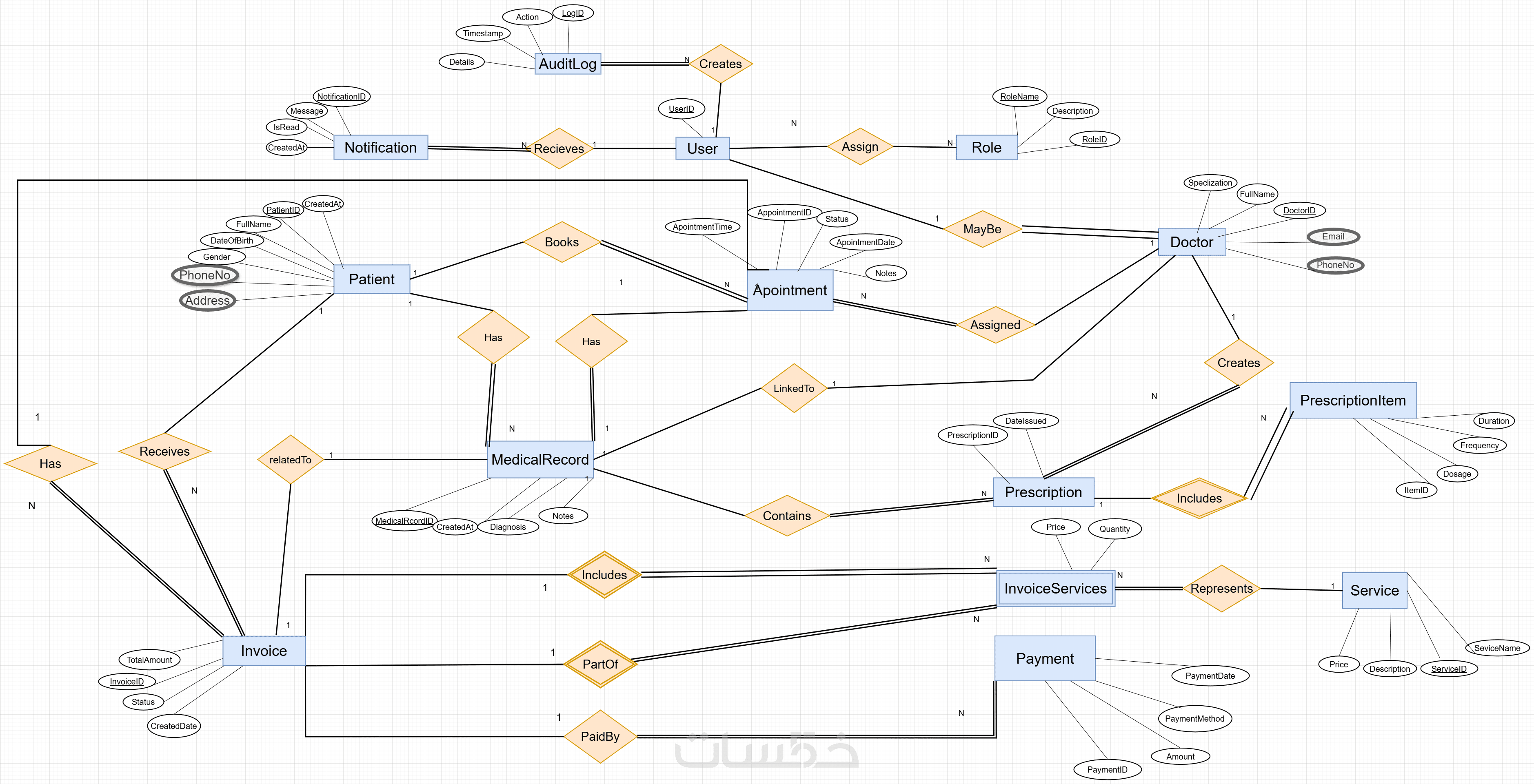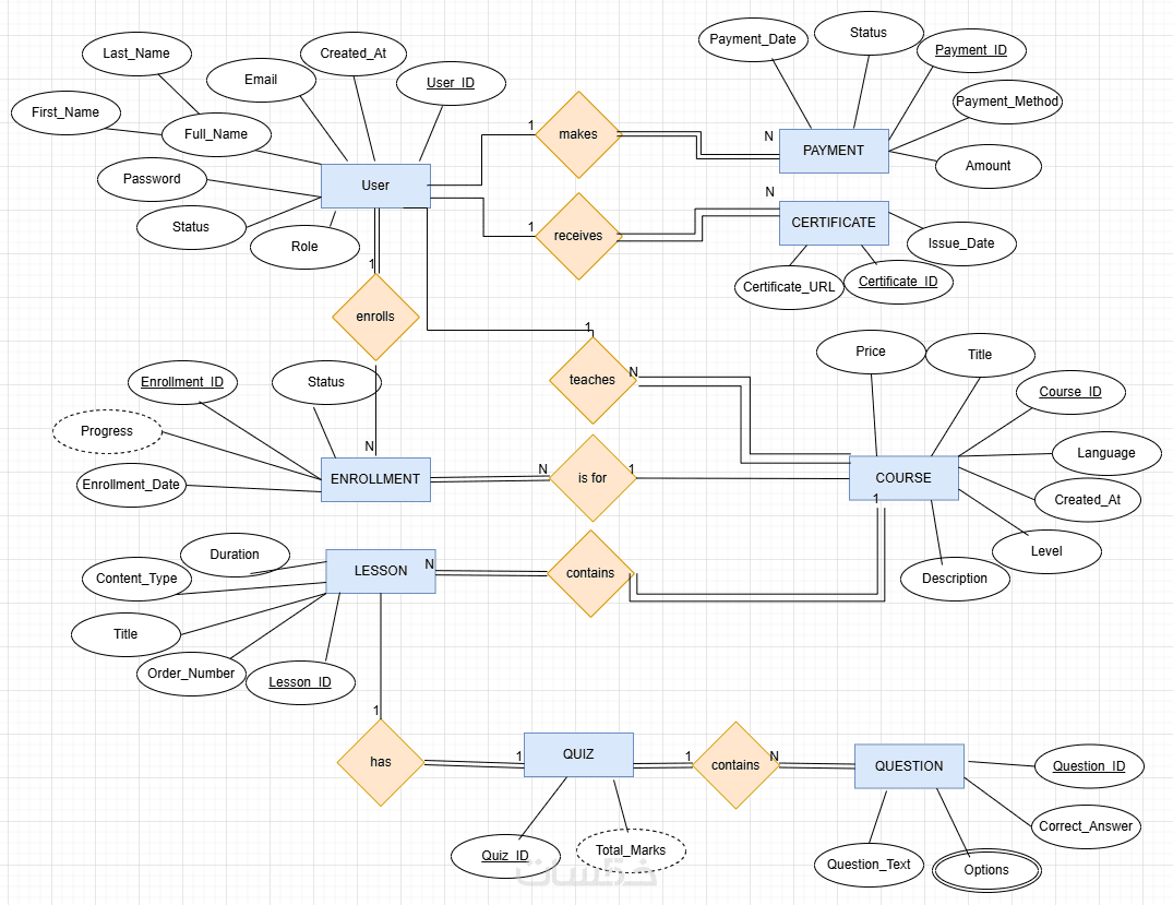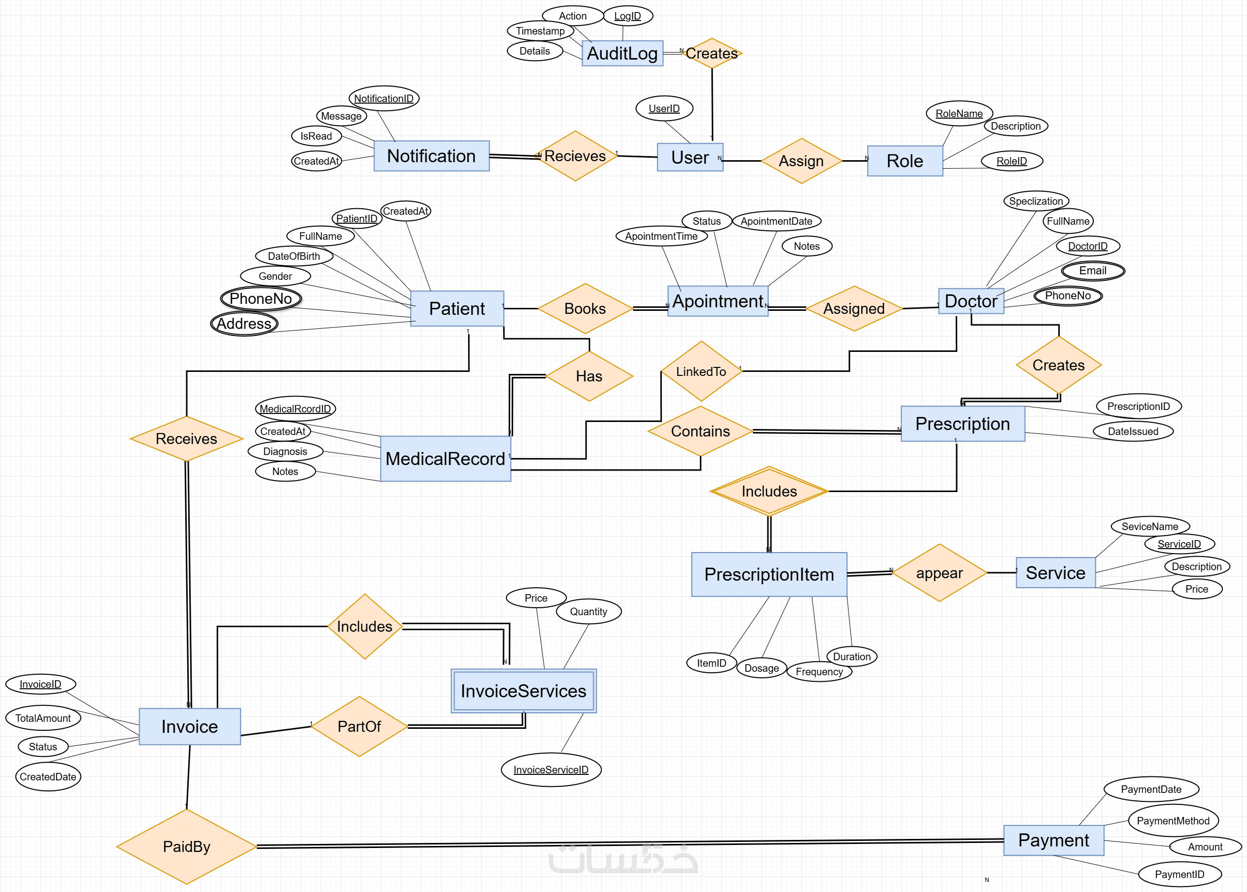 سأقوم بتحليل فكرة مشروعك ثم تصميم مخطط ERD واضح ومنظم يوضح: