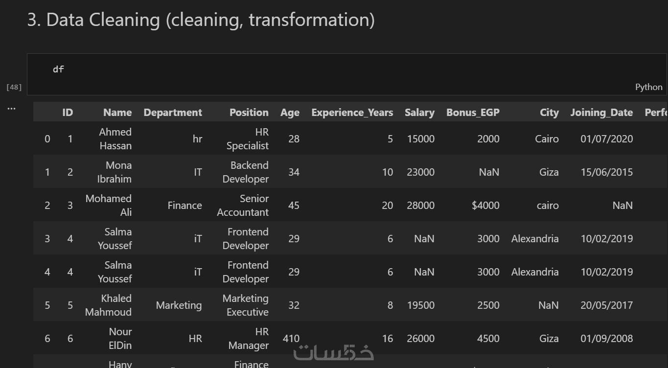 أصحح الأخطاء الموجودة في البيانات وأحول الأنواع (مثل تحويل النصوص إلى أرقام أو العكس) بشكل مناسب، لضمان أن كل عمود يعمل بالطريقة المطلوبة