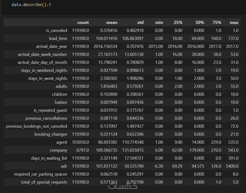 خدمة تحليل بيانات (EDA) تساعدك على فهم سلوك العملاء واستخراج رؤى قوية من بياناتك مثل بيانات حجوزات الفنادق، حيث أقوم بتنظيف البيانات، معالجة القيم المفقودة والشاذة، وتحليل العوامل المؤثرة على إلغاء الحجوزات والتسعير ومدة الإقامة، مع إنشاء رسوم بيانية واضحة وتقرير منظم يدعم اتخاذ القرار. ستحصل على تحليل شامل حتى 50,000 صف بيانات، مع ملف العمل والتقرير النهائي وإمكانية التعديل البسيط بعد التسليم، لتتمكن من تحسين استراتيجياتك واتخاذ قرارات مبنية على البيانات