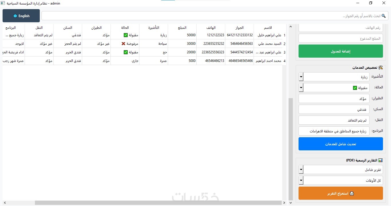 المواصفات: واجهة رسومية (GUI) احترافية تشمل حقول الاسم، الجواز، الهاتف، والمبلغ.